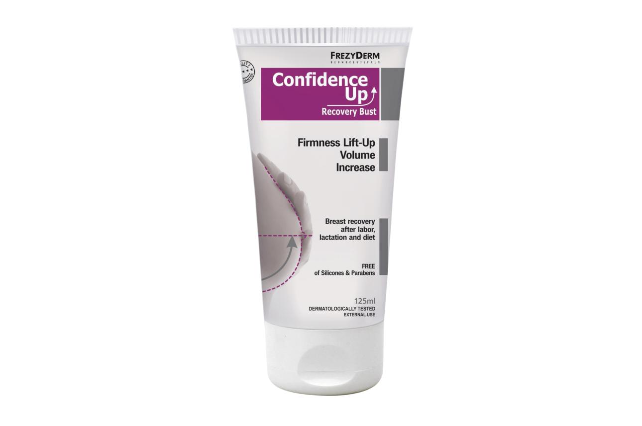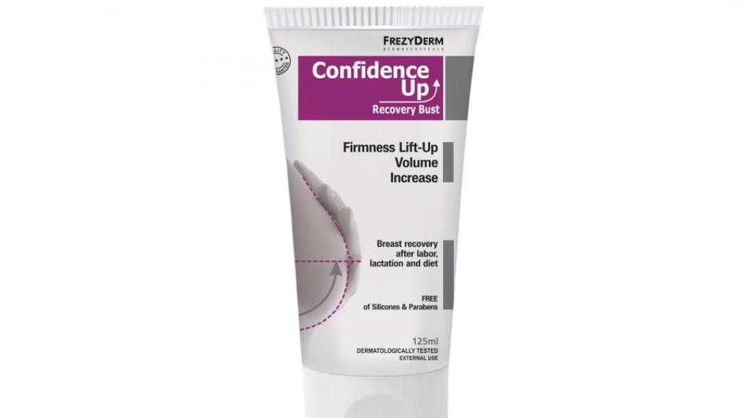 Γι’ αυτό η FREZYDERM δημιούργησε τη νέα εξειδικευμένη κρέμα ανόρθωσης στήθους, Confidence Up cream-gel, με σκοπό να βελτιώσει τη φυσική κατάσταση του μαστού, τονώνοντας συγχρόνως την αυτοπεποίθηση των γυναικών! Πρόκειται για μία απαλή κρέμα – gel που στοχεύει στην ανόρθωση, τη σύσφιξη και την αύξηση όγκου του στήθους. Ουσιαστικά, προστατεύει το κολλαγόνο και την ελαστίνη στην περιοχή του μαστού, ενώ ταυτόχρονα συσφίγγει την επιδερμίδα. Η μοναδική σύνθεση της Confidence Up cream-gel τονώνει και ενυδατώνει σε βάθος το δέρμα. Παράλληλα, ενισχύει την φυσική ανάπτυξη των λιποκυττάρων «γεμίζοντας» το στήθος και προσφέροντας βελτίωση του όγκου και γενικά της εμφάνισής του. Είναι ιδανική για μετά από εγκυμοσύνη, θηλασμό ή παρατεταμένη δίαιτα καθώς και για το ατροφικό στήθος. Πρέπει ωστόσο να επισημανθεί ότι δε συνίσταται η χρήση της κατά τη διάρκεια εγκυμοσύνης και θηλασμού. Τέλος, δεν περιέχει παράγωγα σιλικόνης και Parabens.