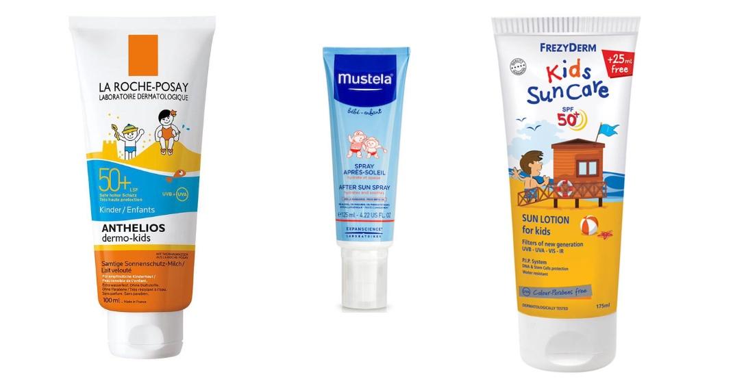 Το κολλάζ φωτογραφιών που ακολουθεί είναι παιδικά after sun που μπορείτε να επιλέξετε, καθώς επίσης και παιδικά αντηλιακά, που πρέπει να εφαρμόζουμε στα παιδιά σε κάθε τους έξοδο και όχι μόνο στην παραλία.