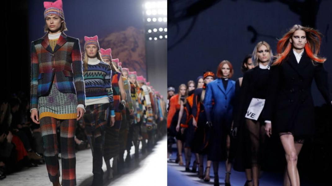Αυτά που αδιαμφισβήτητα ξεχώρισαν ήταν τα Pussyhats που φόρεσαν τα μοντέλα. Τα ροζ σύμβολα διαμαρτυρίας και γυναικείας αλληλεγγύης. Τα σκουφάκια αυτά με τα αυτιά γάτας έχουν πάρει το όνομα «pussy hats», θέλοντας να κάνουν ένα λογοπαίγνιο με τη λέξη «pussy», που στα αγγλικά σημαίνει γάτα (αλλά είναι και ένας τρόπος αναφοράς στα γυναικεία γεννητικά όργανα). Τη λέξη αυτή «pussy» είχε χρησιμοποιήσει ο Τραμπ στο βίντεο που είχε προκαλέσει σκάνδαλο όταν δημοσιοποιήθηκε τον Οκτώβριο, στο οποίο ακουγόταν να λέει ότι μπορεί να πληρώνει γυναίκες και να τις παρενοχλεί.