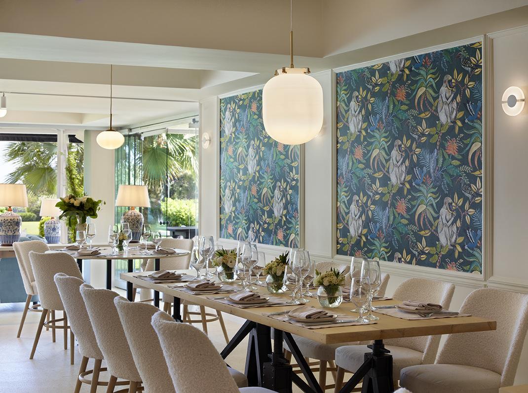 Οι ζωγραφιστοί πίνακες και οι ταπετσαρίες συνδυάζονται με φωτιστικά εμπνευσμένα από το ζωικό βασίλειο και πετρόλ καναπέδες, δημιουργώντας μια «μικρή ζούγκλα», που ηρεμεί και χαλαρώνει τις αισθήσεις.