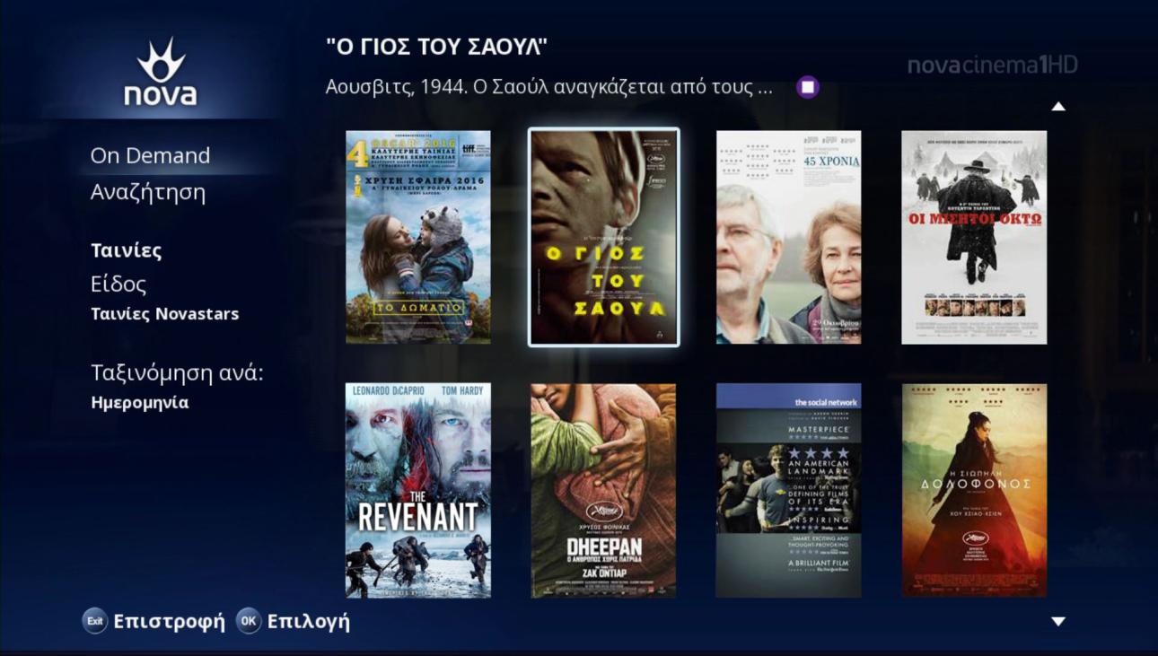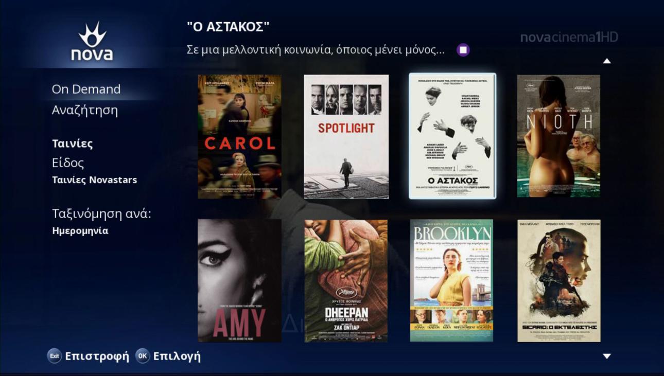 Οι λάτρεις του σινεμά μπορούν να παρακολουθούν καθημερινά μέσα από την υπηρεσία Nova On Demand το πιο πλούσιο και πλήρες περιεχόμενο με εκατοντάδες μεγάλες πρεμιέρες, επιτυχημένες τηλεοπτικές σειρές και ολόκληρους κύκλους και φυσικά τις βραβευμένες ταινίες. Έτσι, το Φεβρουάριο, μεταξύ άλλων, θα μπορούν να απολαύσουν, την υποψήφια για Όσκαρ Σεναρίου ταινία «Ο Αστακός», σε σενάριο του Γιώργου Λάνθιμου και του Ευθύμη Φιλίππου αλλά και μεγάλες Οσκαρικές επιτυχίες όπως την υποψήφια για 6 Όσκαρ ταινία «Carol» με πρωταγωνίστρια την κορυφαία Κέιτ Μπλάνσετ, «Το δωμάτιο» με πρωταγωνίστρια την Μπρι Λάρσον -η οποία για την ερμηνεία της απέσπασε το Όσκαρ Ά Γυναικείου Ρόλου. Παράλληλα, την ταινία «Brooklyn» με 3 υποψηφιότητες στα Όσκαρ και την αληθινή ιστορία, «Spotlight: Όλα στο φώς», η οποία απέσπασε 2 βραβεία Όσκαρ, το βραβείο SAG για το Καλύτερο Καστ και το BAFTA Καλύτερου Πρωτότυπου Σεναρίου.