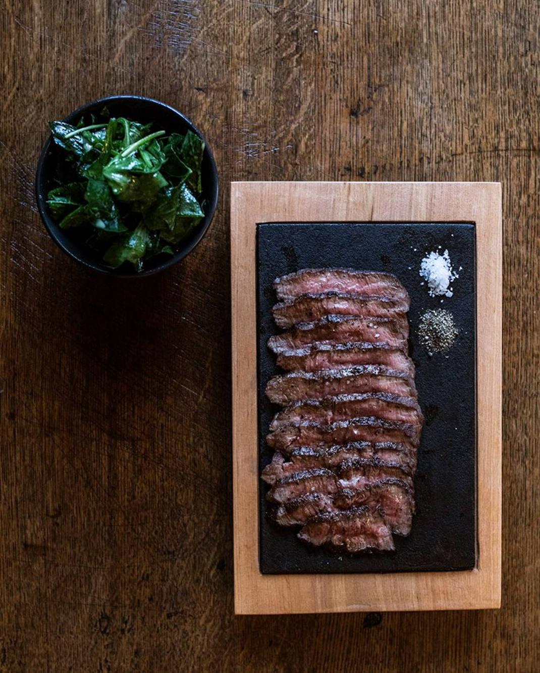 Η κάρτα του μενού περιλαμβάνει δύο πιάτα: μια τρυφερή μπριζόλα flat iron από μοσχαρίσιο χτένι που συνοδεύεται από σαλάτα σπανάκι και ένα λαχταριστό μοσχαρίσιο burger με σωτέ κρεμμύδια και béarnaise, που σερβίρεται μαζί με χειροποίητα chips.