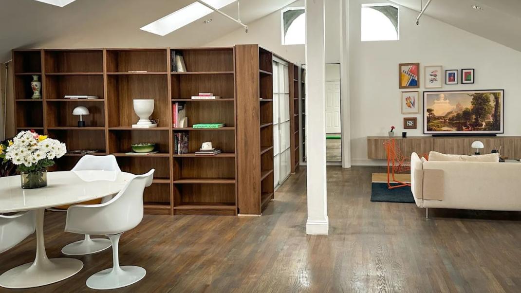 Ο Ισαάκ τοποθέτησε τις έξι βιβλιοθήκες Billy από το ΙΚΕΑ σε σχήμα κουτιού στην πίσω αριστερή γωνία του στούντιο, δημιουργώντας ουσιαστικά ένα δωμάτιο μέσα στο δωμάτιο.