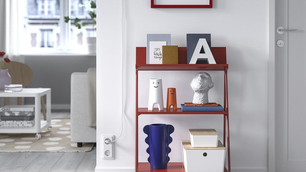 Η παρακάτω πρόταση της διακοσμήτριας από τα ΙΚΕΑ αφορά ένα ράφι ύψους περίπου ενός μέτρου, με λιτή γραμμή και έντονη παρουσία χάρη στο κόκκινο χρώμα του. Δεν πρόκειται για ένα ουδέτερο αντικείμενο που «χάνεται» στον χώρο, αλλά για ένα κομμάτι που λειτουργεί σαν διακοσμητική πινελιά. Τοποθετημένο σε μια γωνιά ανάγνωσης, μπορεί να δώσει χαρακτήρα στο σημείο χωρίς να χρειάζονται πολλά ακόμη διακοσμητικά στοιχεία. Το μάτι πέφτει επάνω του αμέσως, αλλά χωρίς να γίνεται επιθετικό ή υπερβολικό.