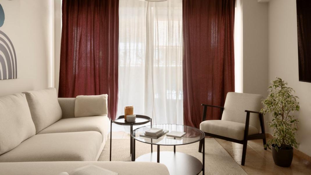Στο Phae Apartment, οι κουρτίνες επιλέχθηκαν με προσοχή για να λειτουργούν ως φίλτρα φωτός και να διαφοροποιούν τα υπνοδωμάτια.