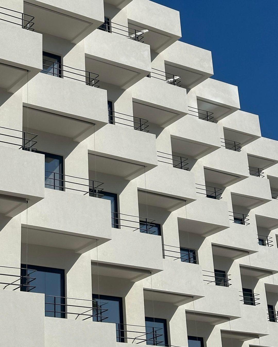 Μια τολμηρή ατμόσφαιρα δημιουργείται αμέσως με την άφιξή σας, καθώς αντανακλάται στη ρυθμική λευκή πρόσοψη του τετραώροφου κτιρίου, με τα μπαλκόνια να προβάλλονται εντυπωσιακά. Δίπλα τους, μια μεγάλη τοιχογραφία εμπνευσμένη από τον David Hockney, σε μπλε αποχρώσεις από την Αθηναία καλλιτέχνιδα Claire Manent, προσθέτει μια ξεχωριστή νότα. «Η εξωτερική όψη έχει σχεδιαστεί για να λειτουργεί ως ορόσημο που γεφυρώνει το παρελθόν με το μέλλον», εξηγεί στο Wallpaper ο Alphonse Sarthout, συνιδρυτής της Ciguë. «Το κτίριο απογυμνώθηκε μέχρι τον σκελετό του από σκυρόδεμα, ώστε να ενισχυθεί η γεωμετρική του καθαρότητα χωρίς να καταστραφεί».
