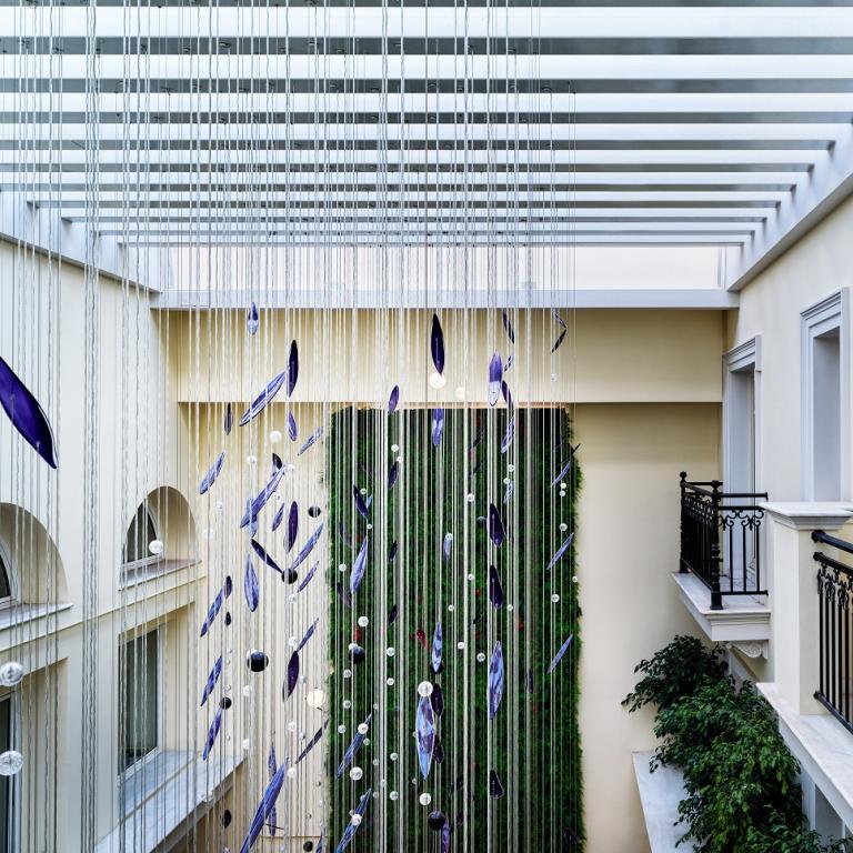 Στο εσωτερικό, οι πινελιές του ελληνικού μοντερνισμού εκφράζονται μέσα από καθαρές γραμμές και καμπύλες, με προσεκτική επιλογή vintage επίπλων και ζεστές υφές από μια τοπική παλέτα υλικών (λευκά που αντανακλούν τον ήλιο, πέτρες, μάρμαρα και terrazzo). Η ακατέργαστη ενέργεια της ανερχόμενης σύγχρονης δημιουργικής σκηνής της Ελλάδας είναι ένα ακόμη βασικό συστατικό, με ποικιλία έργων τέχνης, από υφάσματα κρεβατιών έως πίνακες ζωγραφικής, που προέρχονται από περισσότερους από δώδεκα καλλιτέχνες και τεχνίτες από όλη τη χώρα. Αυτή η συλλογή αντικατοπτρίζει τη συνεχιζόμενη πολιτιστική αναγέννηση της Αθήνας μετά την οικονομική κρίση.