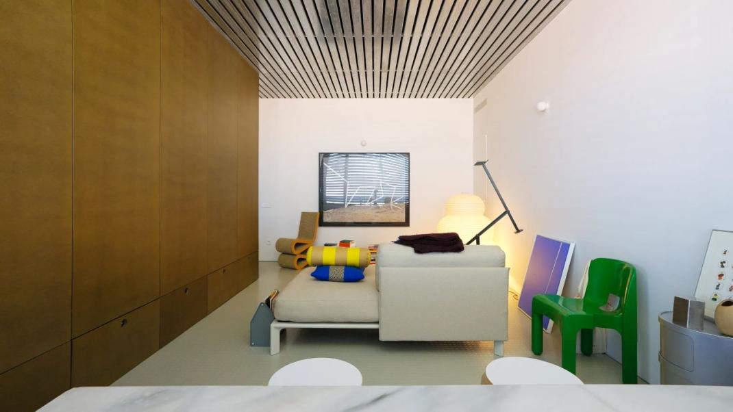 Δύο μεγάλες μονάδες MDF ορίζουν τον χώρο. Η πρώτη είναι ένα βαθύ πράσινο έπιπλο που ενσωματώνει αποθηκευτικούς χώρους και την κρεβατοκάμαρα, ανεβαίνοντας πάνω σε μια πλατφόρμα. Ο Μεδιέρο χαρακτηρίζει το δωμάτιο «σχεδόν μοναστικό», λιτό και καταφύγιο σε αντίθεση με το ανοιχτό σαλόνι, όπου κυριαρχούν τα βιομηχανικά φινιρίσματα.