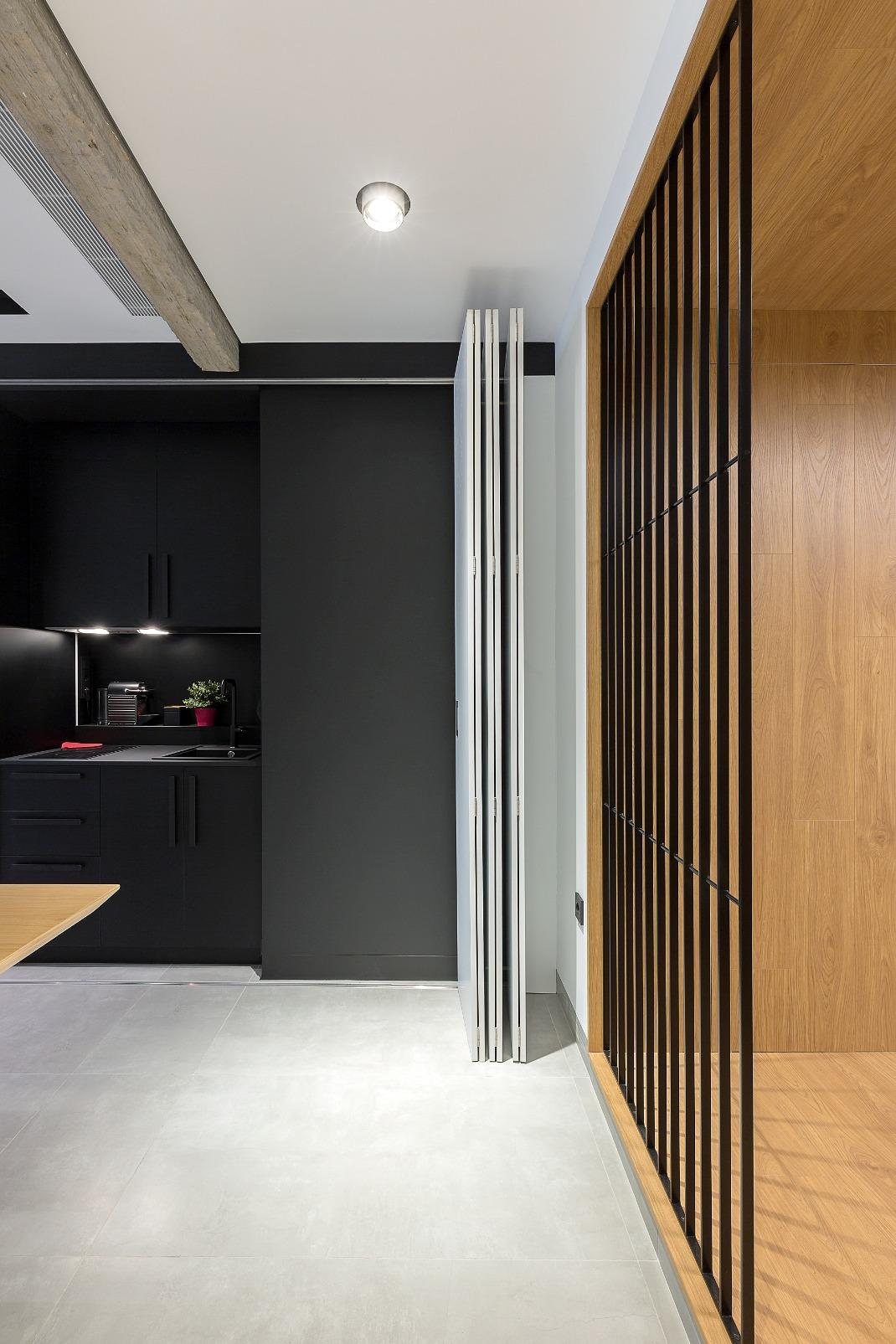 Σε δεύτερη φάση και εφόσον ο χρήστης το επιθυμεί, ανοίγοντας τις συρόμενες πόρτες, μπορεί να αξιοποιήσει όποιο τμήμα της κουζίνας επιθυμεί. «Το μαύρο δίνει βάθος, μεγαλώνει τον χώρο και ωθεί τον χρήστη σε μια παροδική ψευδαίσθηση ότι πίσω από τα λευκά πορτάκια, κρύβεται κάτι μεγαλύτερο που δεν έχει ακόμα ανακαλύψει. Αυτή η ψευδαίσθηση, θα τον ωθήσει επίσης και να κλείσει ξανά τις πόρτες. Να επανέλθει η ηρεμία και η ισορροπία στον χώρο» καταλήγουν οι αρχιτέκτονες.