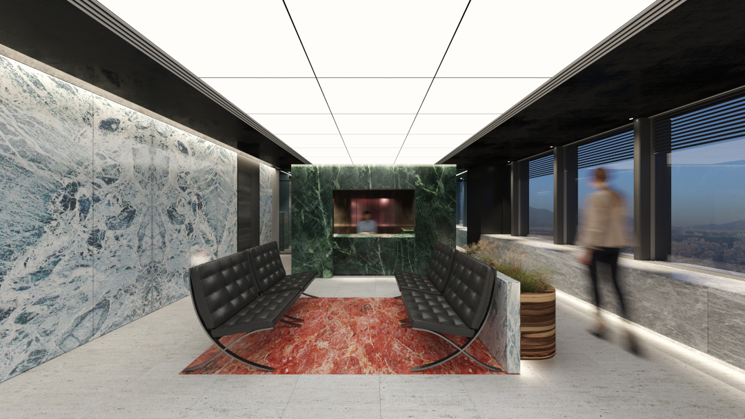 Ο τοίχος της εισόδου είναι επενδυμένος με μάρμαρο τύπου Macauba. Η τεχνική εφαρμογής του μαρμάρου «βιβλίο» (book-matching) εξασφαλίζει μια οπτική συνέχεια, μετατρέποντας τον τοίχο της εισόδου σε ένα ενοποιητικό πολυτελές φόντο.