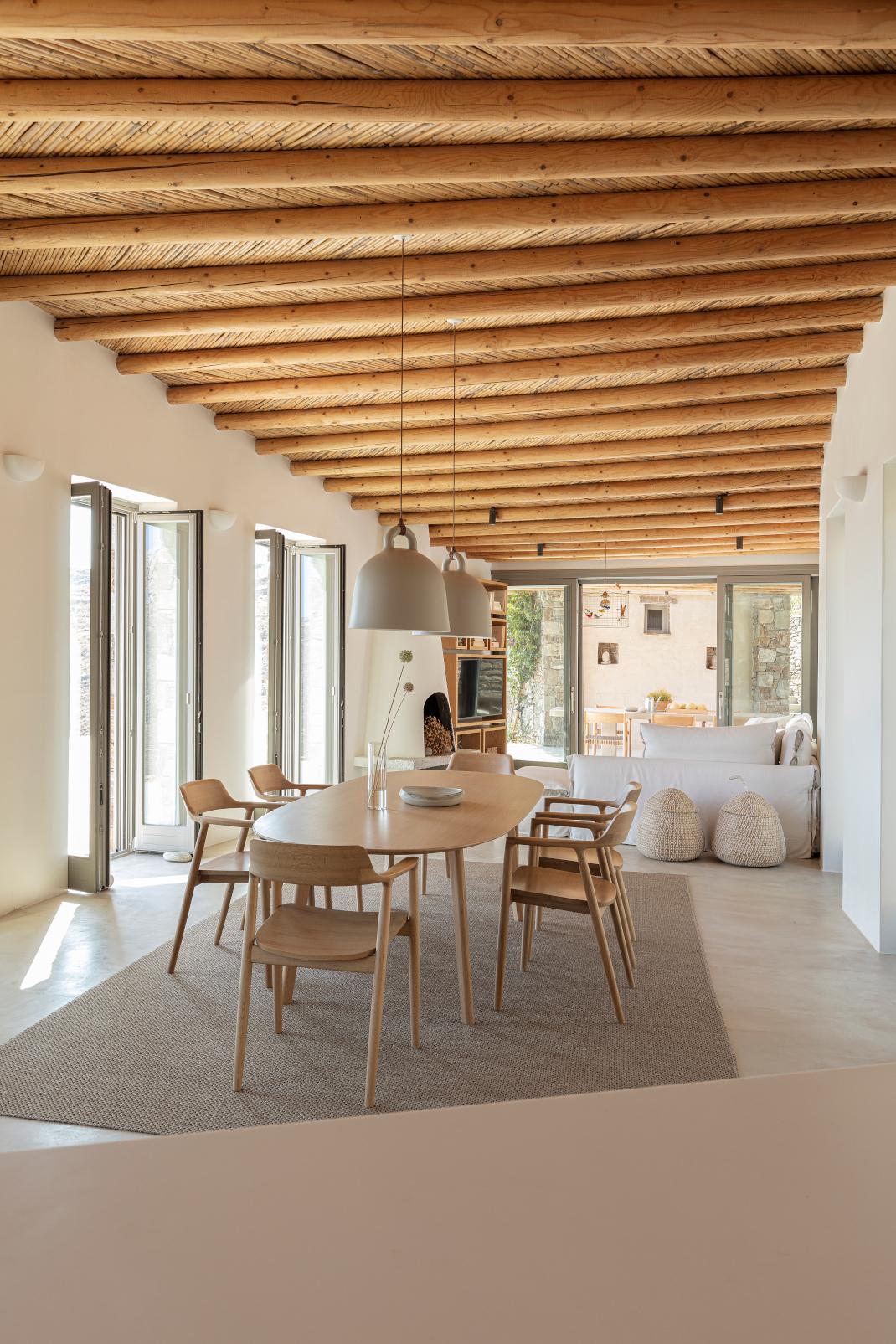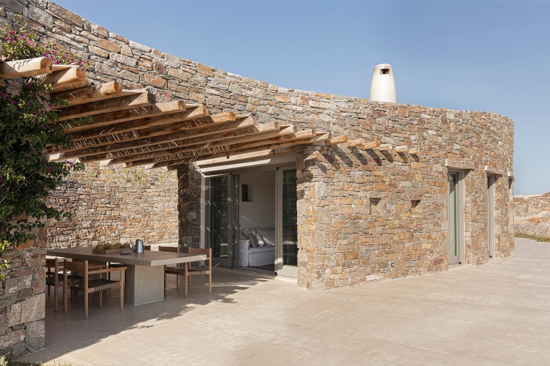 Τόσο οι εσωτερικοί όσο και οι εξωτερικοί χώροι ολοκληρώνονται από ξύλινες πέργκολες, χαρακτηριστικό των αγροτικών κυκλαδίτικων σπιτιών.