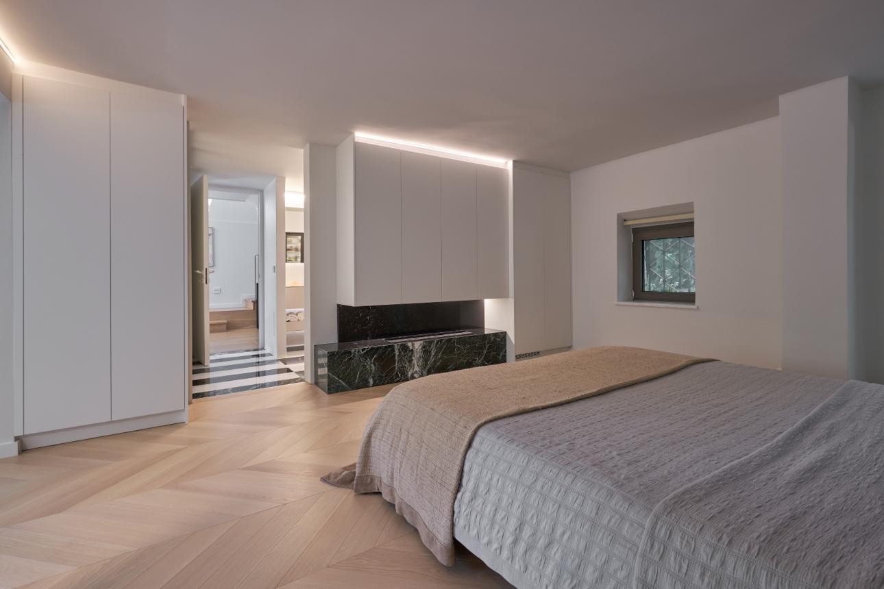 Το ανοιχτό en-suite μπάνιο, που λειτουργεί ως είσοδος στο υπνοδωμάτιο, επανασχεδιάστηκε με ένα ξεχωριστό δάπεδο από κολάζ μαρμάρων, το οποίο δημιουργεί έντονη αντίθεση με τον χαμηλοτάβανο, ατμοσφαιρικό χώρο του υπνοδωματίου.