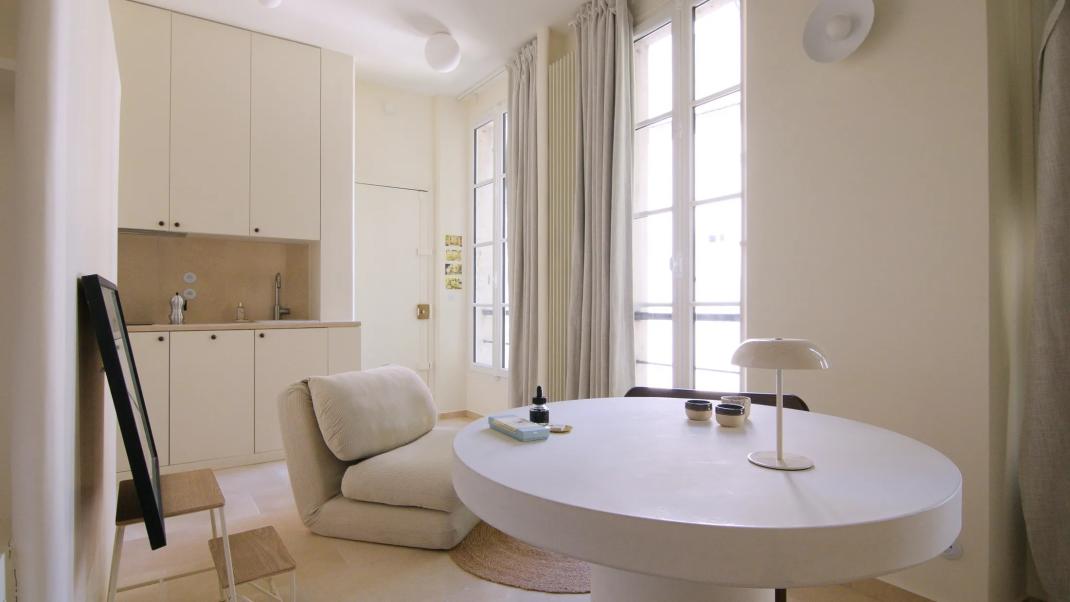 Ένα διαμέρισμα μόλις 24 τετραγωνικών μέτρων στο κέντρο του Παρισιού δεν φαντάζει ιδανικό για άνετη διαβίωση. Πόσο μάλλον όταν βρίσκεται μέσα σε ένα παλιό καθολικό σχολείο του 19ου αιώνα και κουβαλάει πάνω του όλα τα σημάδια της εγκατάλειψης: ξεθωριασμένες μοκέτες, κουρτίνες με λουλούδια, τοίχους βαμμένους από τον χρόνο. Όμως ο αρχιτέκτονας Αουρελιέν Ντυνί κατάφερε να του δώσει νέα ζωή, μετατρέποντάς το σε ένα φωτεινό, καλαίσθητο και ιδιαίτερα έξυπνα σχεδιασμένο στούντιο με αέρα Νότου.