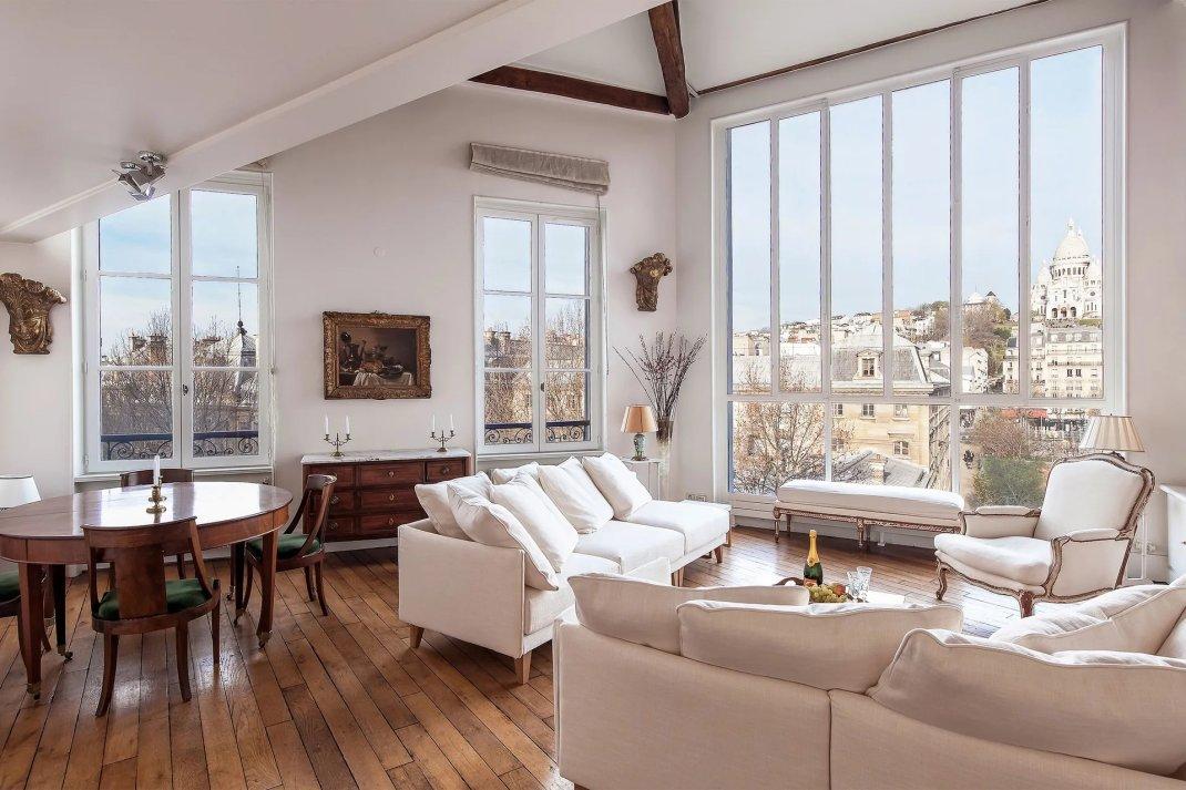 Γυαλιστερό παρκέ, ξύλινα δοκάρια που τρίζουν και έπιπλα αντίκες χαρακτηρίζουν αυτό το loft στη Μονμαρτη. Η θέα είναι ονειρική: το ηλιοβασίλεμα, μπορείτε να ανεβείτε την ετοιμόρροπη μεταλλική σκάλα και να πάτε στην ταράτσα για να δείτε το Sacre Coeur σε όλο του το μεγαλείο.