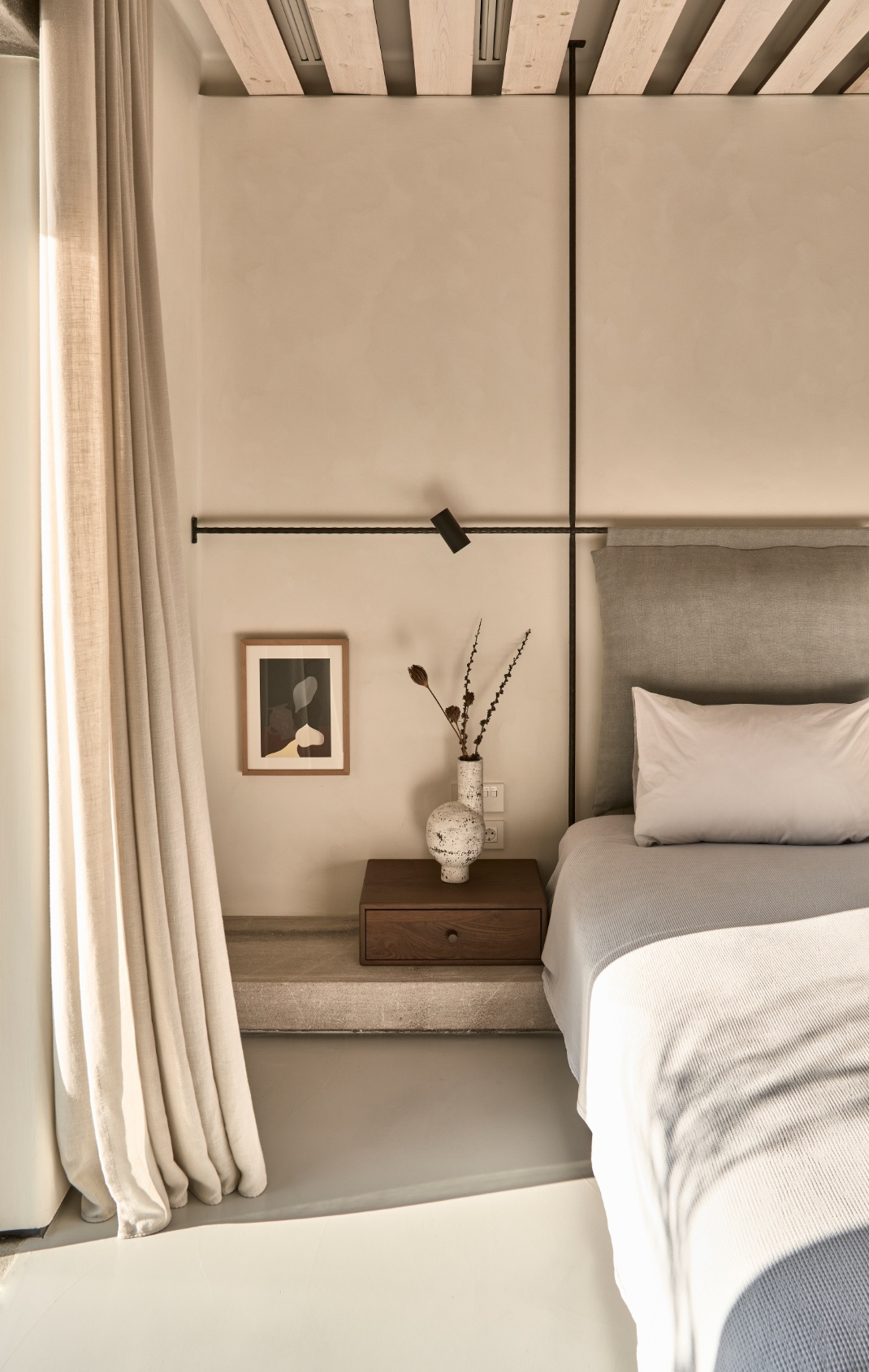 Οι σοβατισμένες επιφάνειες με τις στρογγυλεμένες τους ακμές εκτείνονται λείες. Η πέργκολα από καρυδιά με ενισχυμένη τη στατική της ικανότητα μέσω μιας διαδικίδωσης glue-lam, καταφέρνει να κάθεται ανάλαφρα πάνω στους λευκούς όγκους, σκιάζοντας απαλά και προστατεύοντας την μεγάλη αυλή.