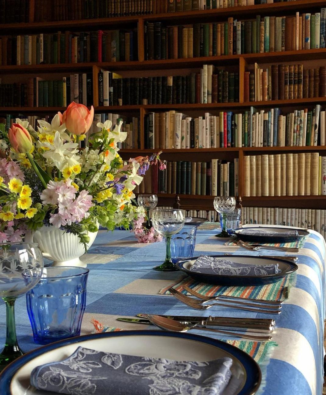 Το τραπέζι έχει τοποθετηθεί στρατηγικά μπροστά από μια μεγάλη ξύλινη βιβλιοθήκη γεμάτη παλιά βιβλία που συλλέγει ο Robin.