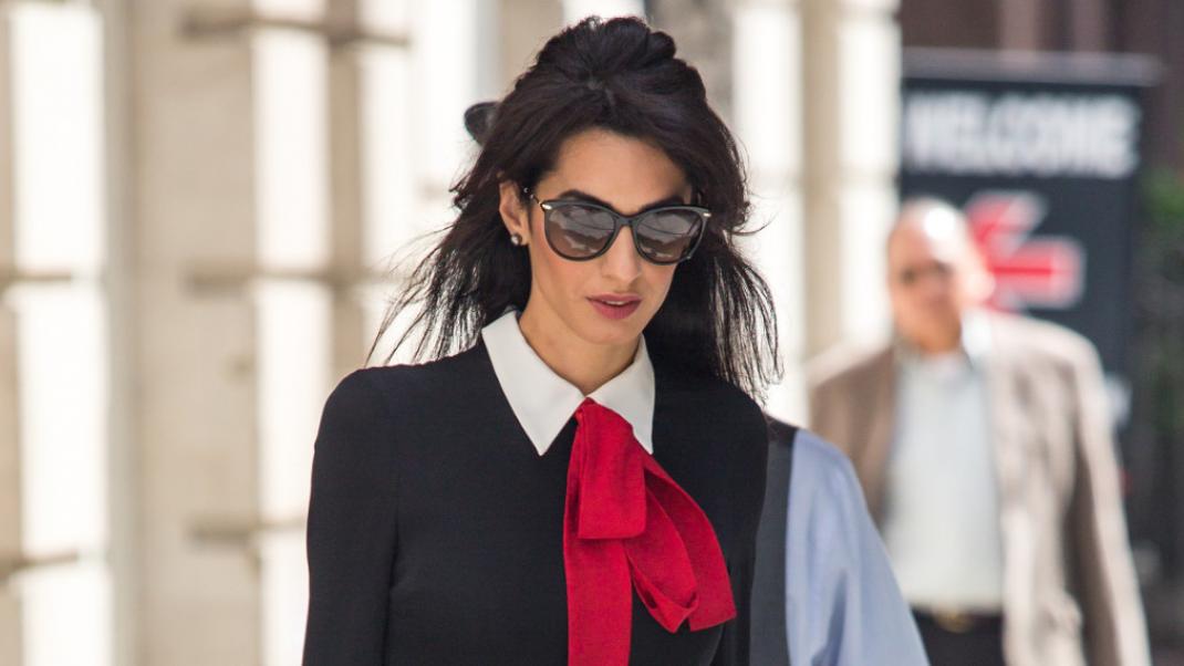 Η Αμάλ επέλεξε ένα κομψό μαύρο ταγιέρ που συνδύασε με γκρι τσάντα, μαύρα γυαλιά ηλίου και ψηλοτάκουνες γόβες, σε γκρι χρώμα με μαύρες λεπτομέρειες.