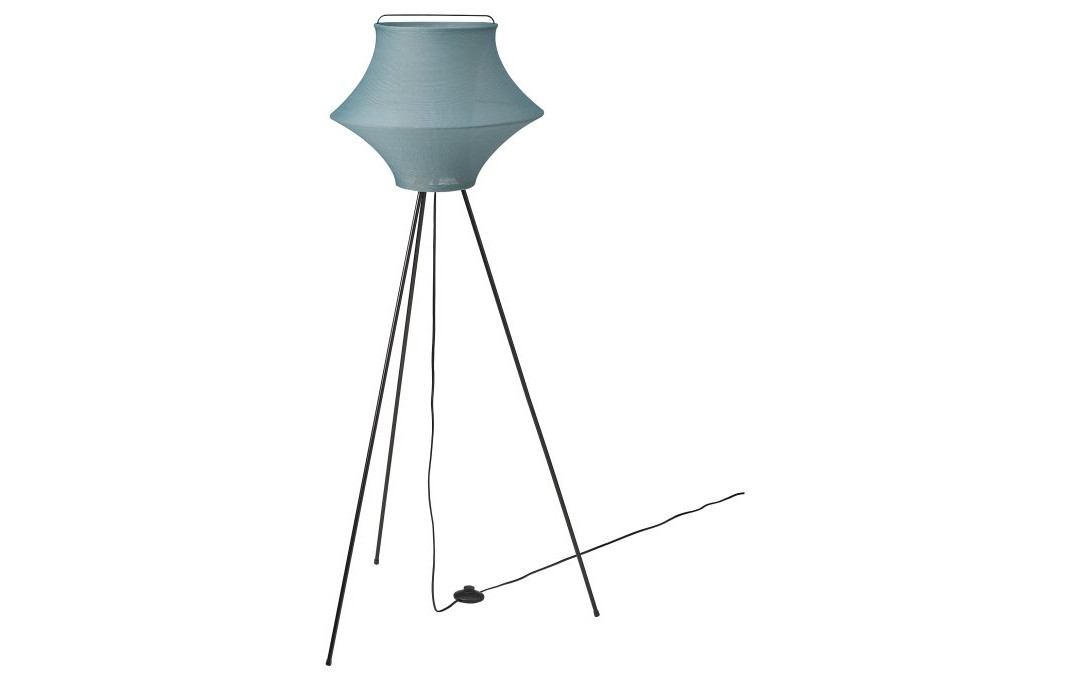 Πρόκειται για ένα φωτιστικό δαπέδου με τρία μαύρα, μεταλλικά πόδια που μοιάζει με τρίποδο. Το καπέλο είναι από ελαστικό ύφασμα σε τιρκουάζ χρώμα και έχει ένα πολύ ιδιαίτερο σχήμα.