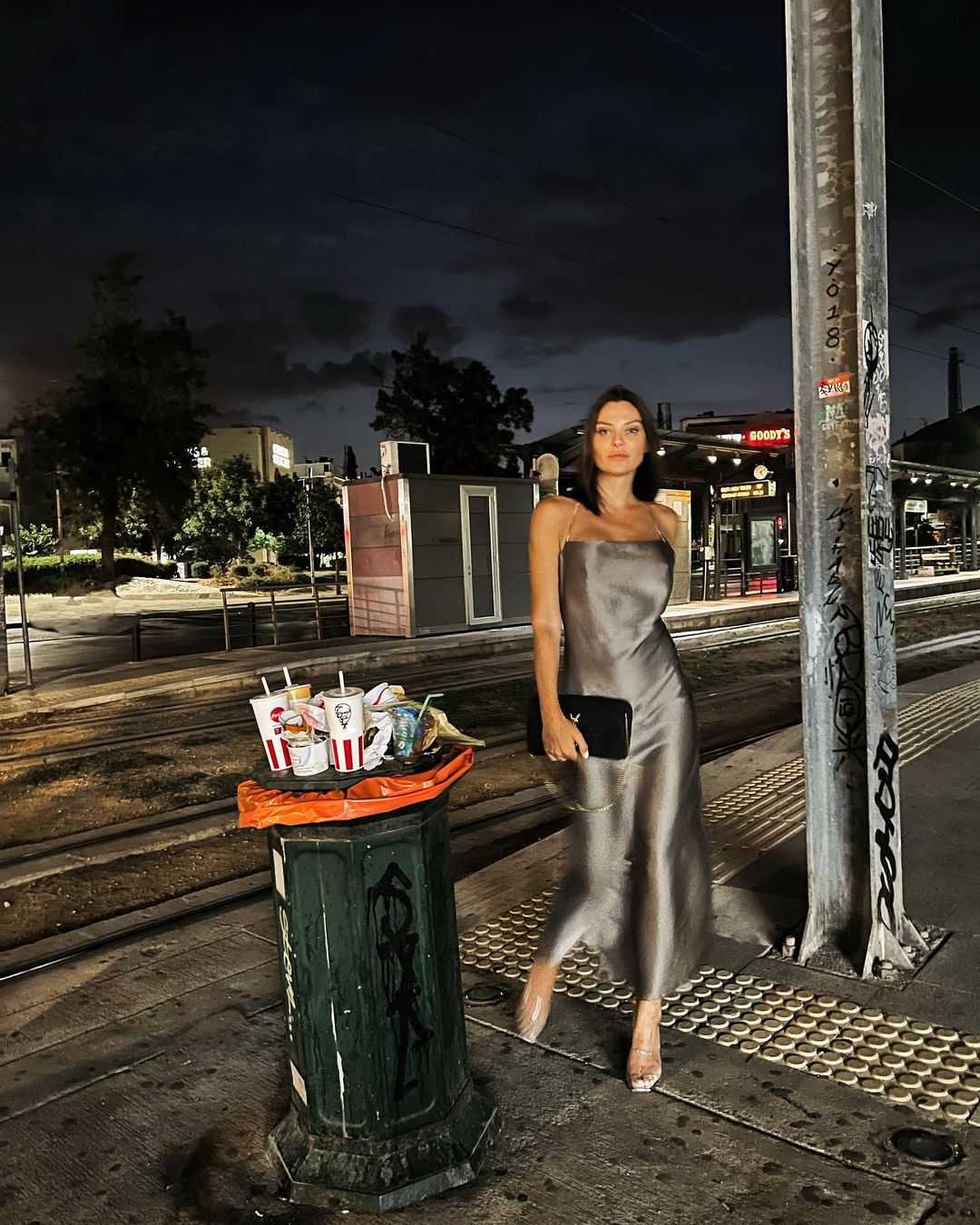 Η Yβόννη Μπόσνιακ δημοσίευσε φωτογραφίες της στο προφίλ της στο Instagram φορώντας το υπέροχο slip dress σε ασημί χρώμα της σχεδιάστριας Λιάνας Καμπά.