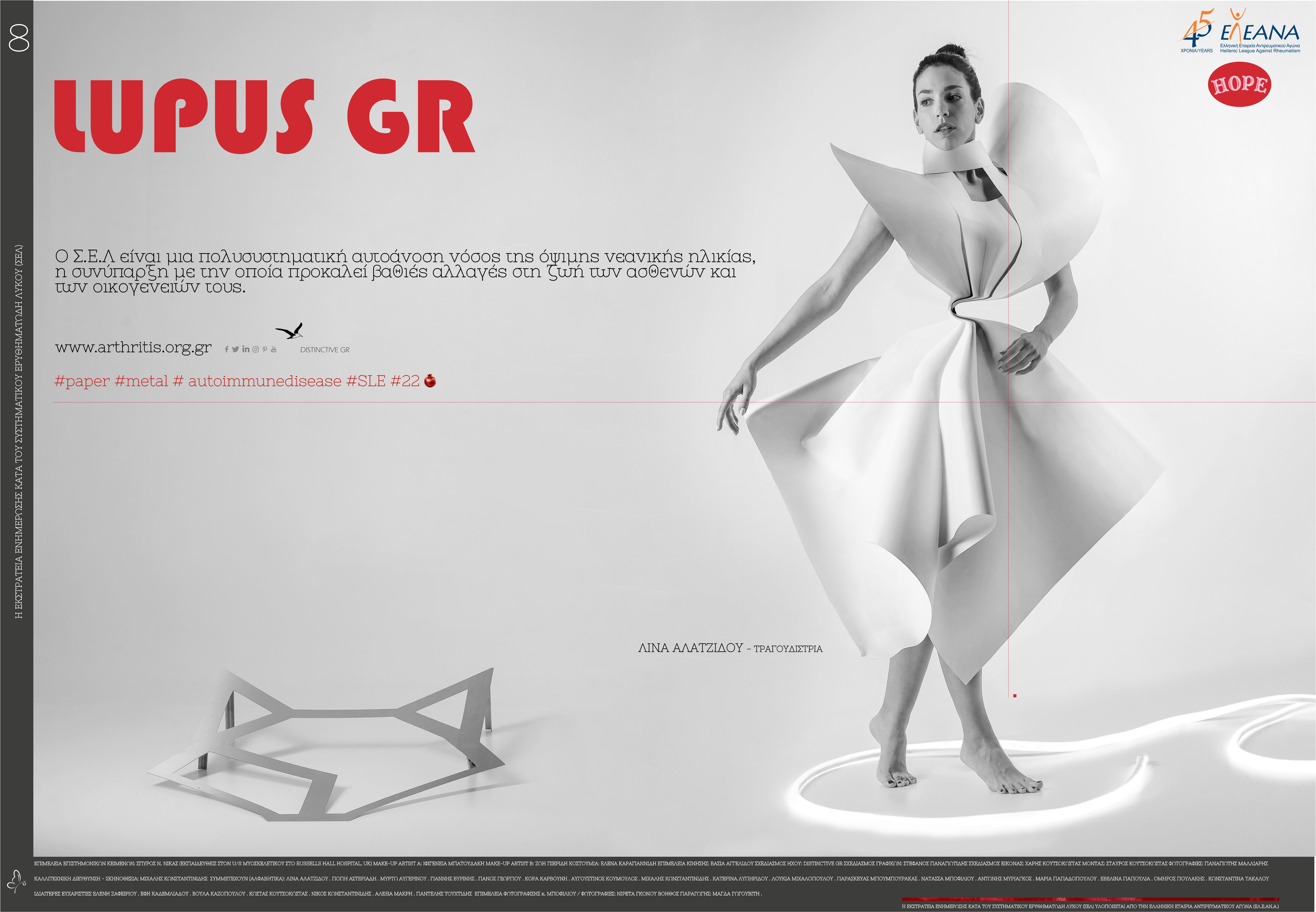 Πείτε μας λίγα λόγια για τη φετινή καμπάνια, τις παρομοιώσεις σχετικά με το μέταλλο και το χαρτί. Πίστα απαιτητική. Στο συγκεκριμένο concept -LUPUS GR - ,όπως αναφέρεται και στο Δελτίο Τύπου, δημιουργήθηκε ένα σύμπαν με υλικά που αναμειγνύονται. Έτσι, το μέταλλο αντιπροσωπεύει το βάρος της νόσου, και το χαρτί, ως εύθραυστο υλικό, την ίδια τη νόσο απ’ την οποία μπορεί να ξεφύγει ο άνθρωπος για να επιβιώσει. Υπάρχουν πράγματα που εξηγούνται κι άλλα που πρέπει να τα αισθανθεί κανείς. Αυτός δεν είναι άλλωστε ο ρόλος της Τέχνης; Να συνδέεται με έναν ιδιαίτερο τρόπο με τη ζωή και παράλληλα να μπορεί να προσεγγίζει ακόμη και ζητήματα υγείας, επιδρώντας στις συνειδήσεις των ανθρώπων, προσφέροντας ελπίδα, ανακούφιση αλλά και μια τάση ελευθερίας.
