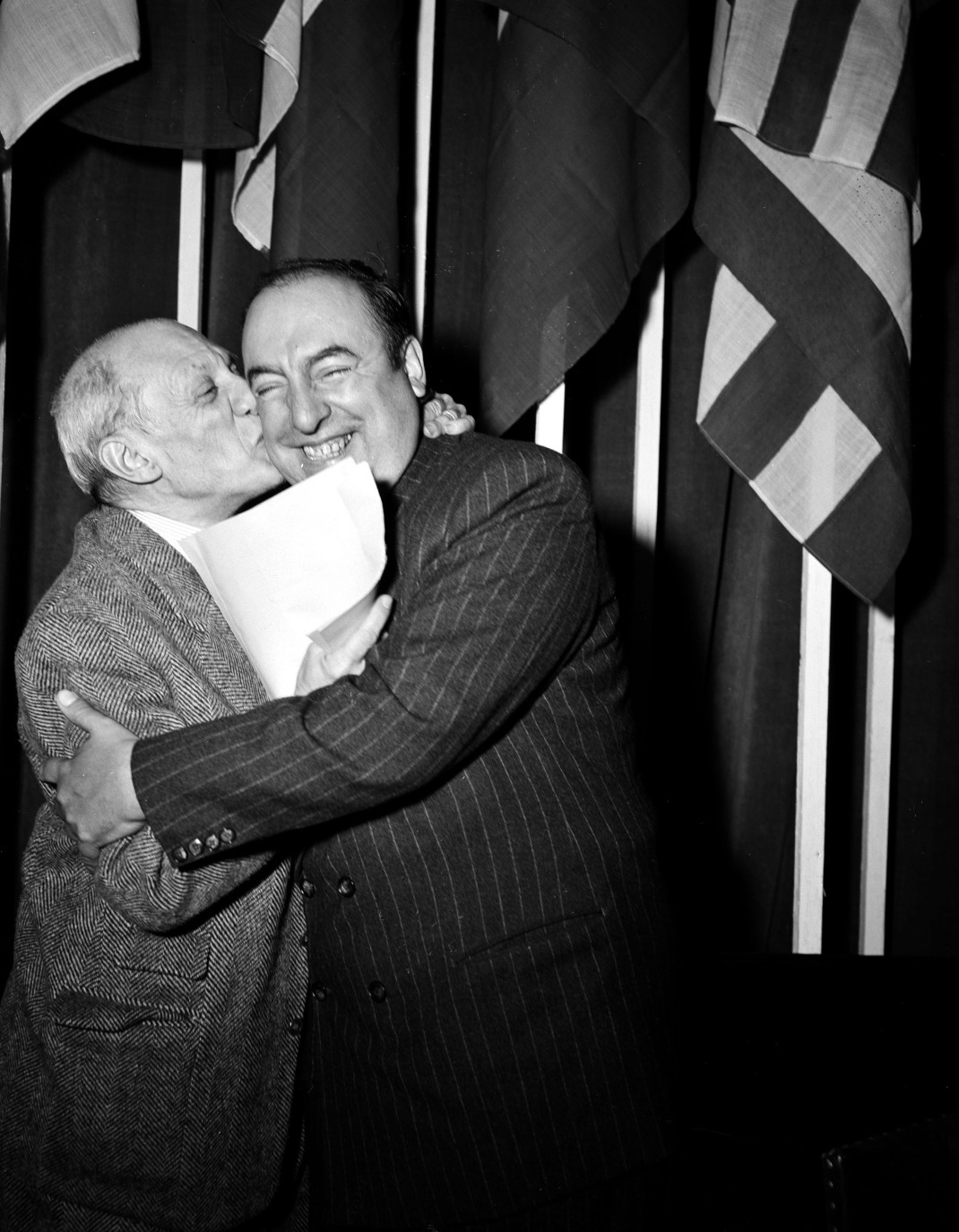 Ο Ισπανός ζωγράφος Πάμπλο Πικάσο (αριστερά), φιλάει τον Χιλιανό ποιητή Πάμπλο Νερούδα / Φωτογραφία: AP