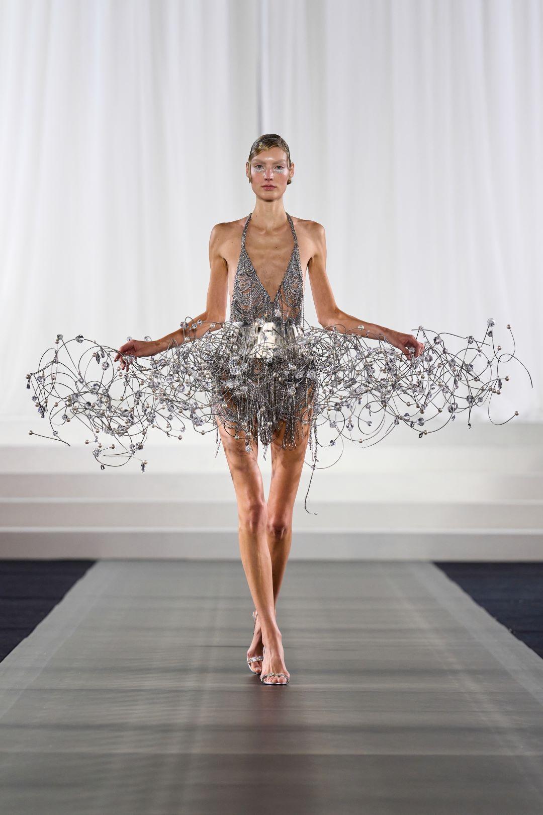 Φτερά, κρόσσια, χειροποίητα κεντήματα, αέρινες σιλουέτες από τούλι και οργάντζα, όγκοι που αψηφούσαν τη βαρύτητα και μια παλέτα που ισορροπούσε ανάμεσα στο απόλυτο μαύρο και λευκό, με πινελιές χρυσού, aqua, κίτρινου και ροζ.