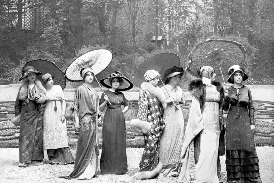 Η ιστορική αναδρομή ξεκινά γύρω στο 1900, όταν οι πρώτες επίδειξεις μόδας λάμβαναν χώρα σε ήσυχες παρισινές μπουτίκ. Οι σχεδιαστές παρουσίαζαν τις συλλογές τους σε πελάτες που καθόντουσαν σε πολυτελή σαλόνια, παρατηρώντας τα μοντέλα να περπατούν αργά ανάμεσα σε πόρτες και διαδρόμους. Το φιλμ Pathé του 1928 -το οποίο κανείς μπορεί να παρακολουθήσει στην έκθεση- δίνει μια σπάνια ματιά στην επίδειξη του House of Worth, διάσημου οίκου της εποχής, όπου τα μοντέλα ανοίγουν τα παλτό τους για να δείξουν τις λεπτομέρειες των ενδυμάτων σε καθισμένους πελάτες.