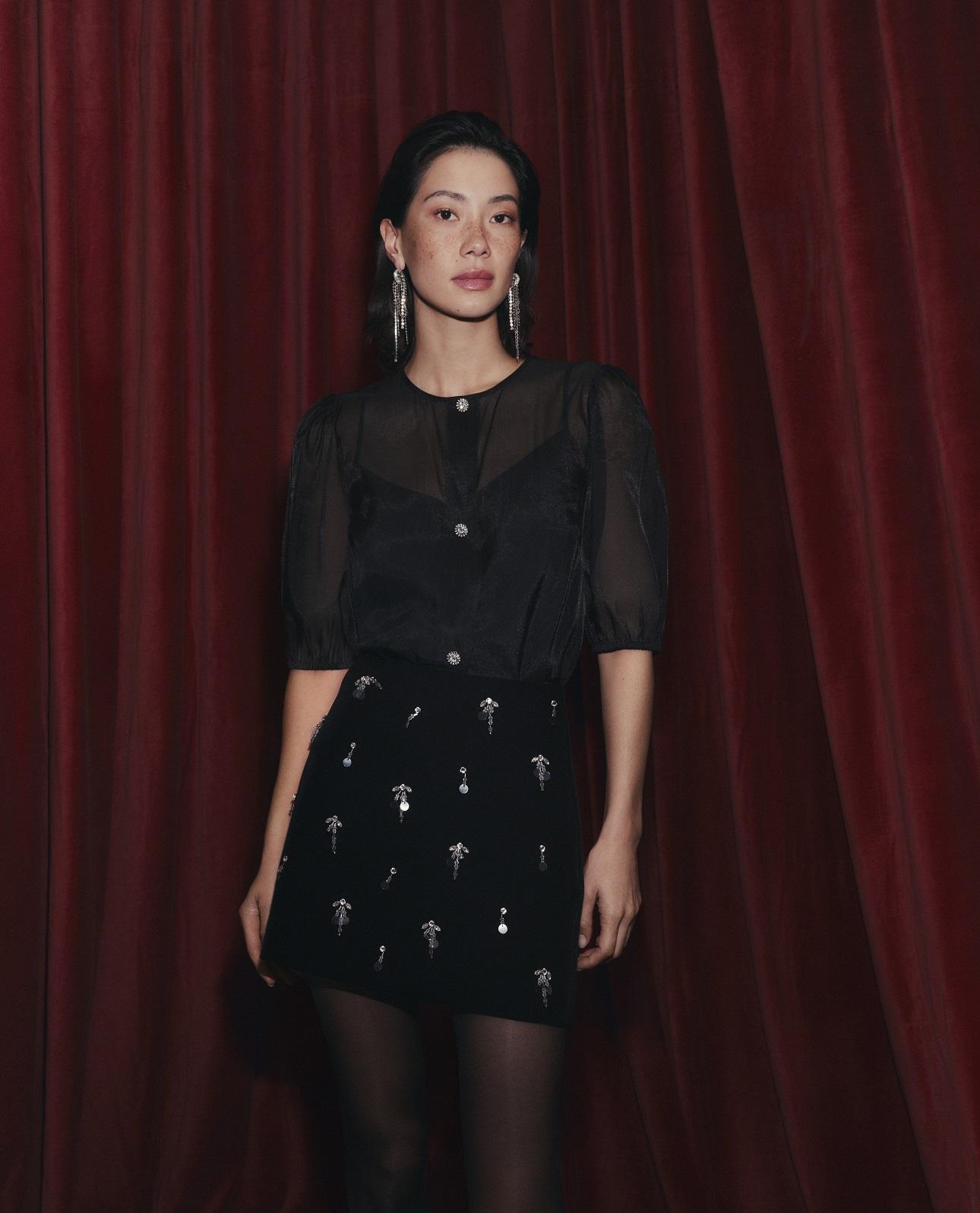 Η συλλογή περιλαμβάνει επίσης statement φούστες, όπως τη μαύρη embellished mini φούστα με κρυστάλλους (T59/8765S), η οποία προσθέτει άμεση λάμψη σε κάθε σύνολο. Πρόκειται για ένα κομμάτι που ενσωματώνει διακριτικές αλλά εντυπωσιακές διακοσμήσεις, κάνοντάς το ιδανικό για συνδυασμό με minimal tops, αλλά και πιο τολμηρές επιλογές.