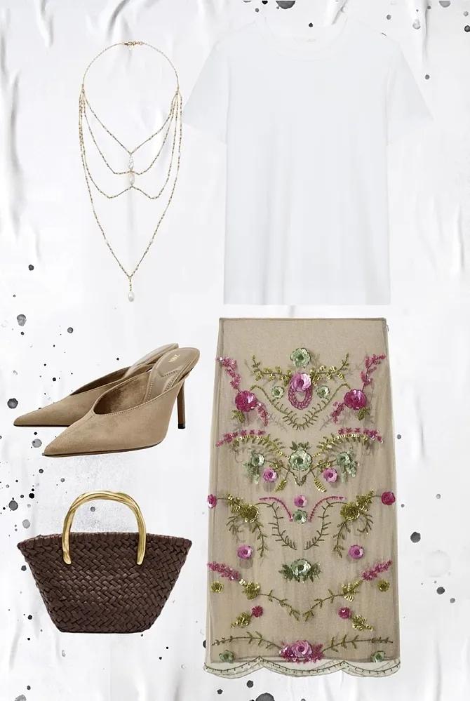 - Βασικό κοντομάνικο T-shirt (12,95 ευρώ). Φούστα με χάντρες (129 ευρώ). Κολιέ με πέρλες (19,95 ευρώ). Mules με τακούνι (29,95 ευρώ). Καφέ πλεκτή τσάντα (35,95 ευρώ). Όλα από Zara.