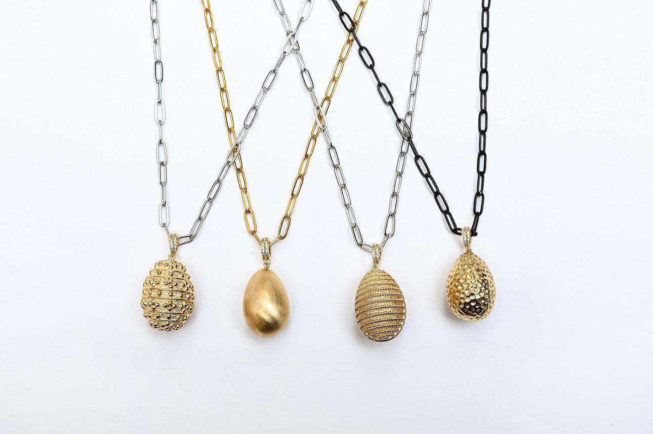 Το “Golden Egg,” εμπνευσμένο από την αρχαία τέχνη της αργυροχρυσοχοΐας, αναδεικνύει μια παράδοση αιώνων. Ένα μενταγιόν σε σχήμα αυγού, από επιχρυσωμένο ορείχαλκο, αιωρείται σε μια μακριά ατσάλινη αλυσίδα σε τόνους χρυσού, ασημιού ή μαύρης πλατίνας. Μέταλλα σε τέλεια ισορροπία.