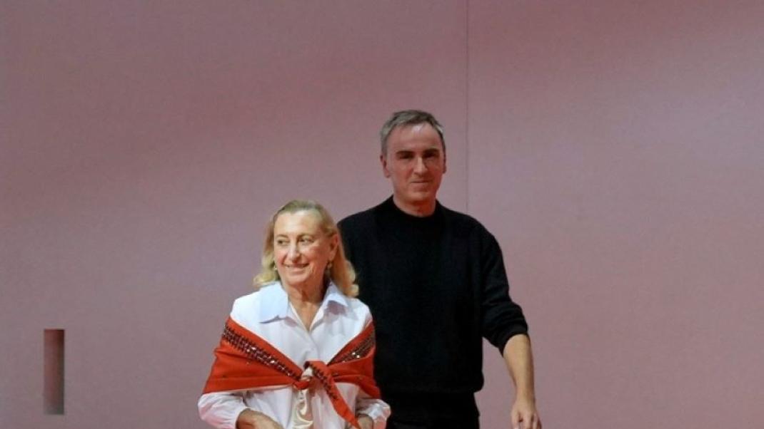 H Μiuccia Prada διατηρεί ένα διακριτικό στιλ : πλισέ φούστα μέχρι το γόνατο, παλτό από μαλλί, μία ή τρεις κονκάρδες στη μπλούζα και ένα φουλάρι που φοριέται με μοναδικό τρόπο. Δεν το δένει στα μαλλιά ούτε στη μέση, αλλά το αφήνει να πέφτει πάνω στους ώμους.