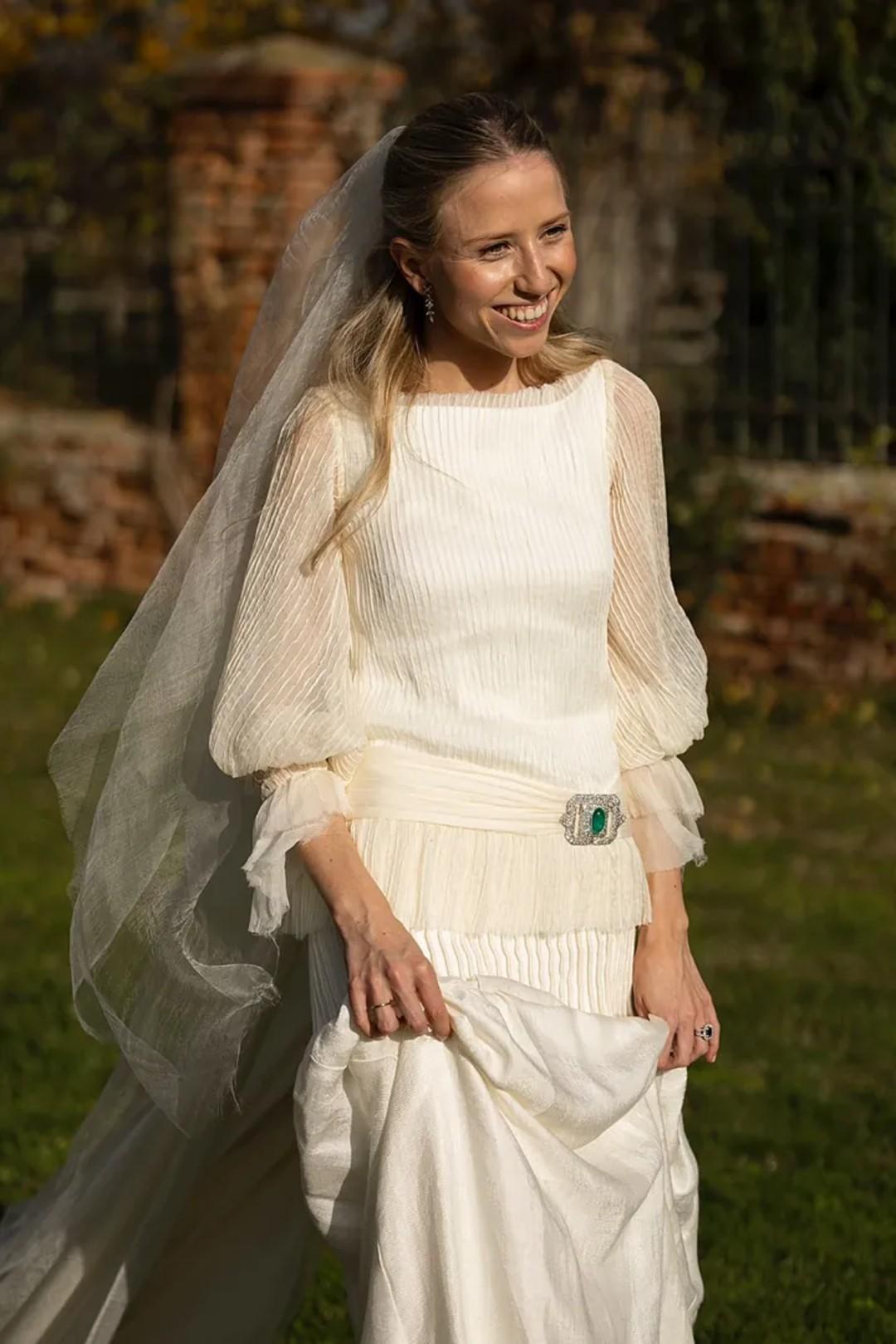 »Της είπα τις ιδέες που είχα και μου έκανε τρία σκίτσα. Μου άρεσαν οι τρεις επιλογές, οπότε φτιάξαμε έναν συνδυασμό όλων για να φορέσω την καρφίτσα της προγιαγιάς μου. Η Isabel μου έδωσε την ιδέα να την βάλω στο πλάι ώστε να μοιάζει με ζώνη», δήλωσε η νύφη.