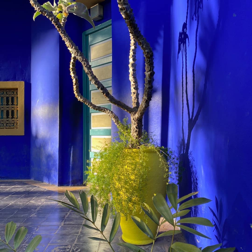 To μπλε ηλεκτρίκ συνδυάζεται με το λαμπερό κίτρινο στη Villa Oasis. Μια επιλογή του Jacques Majorelle που έγραψε ιστορία.