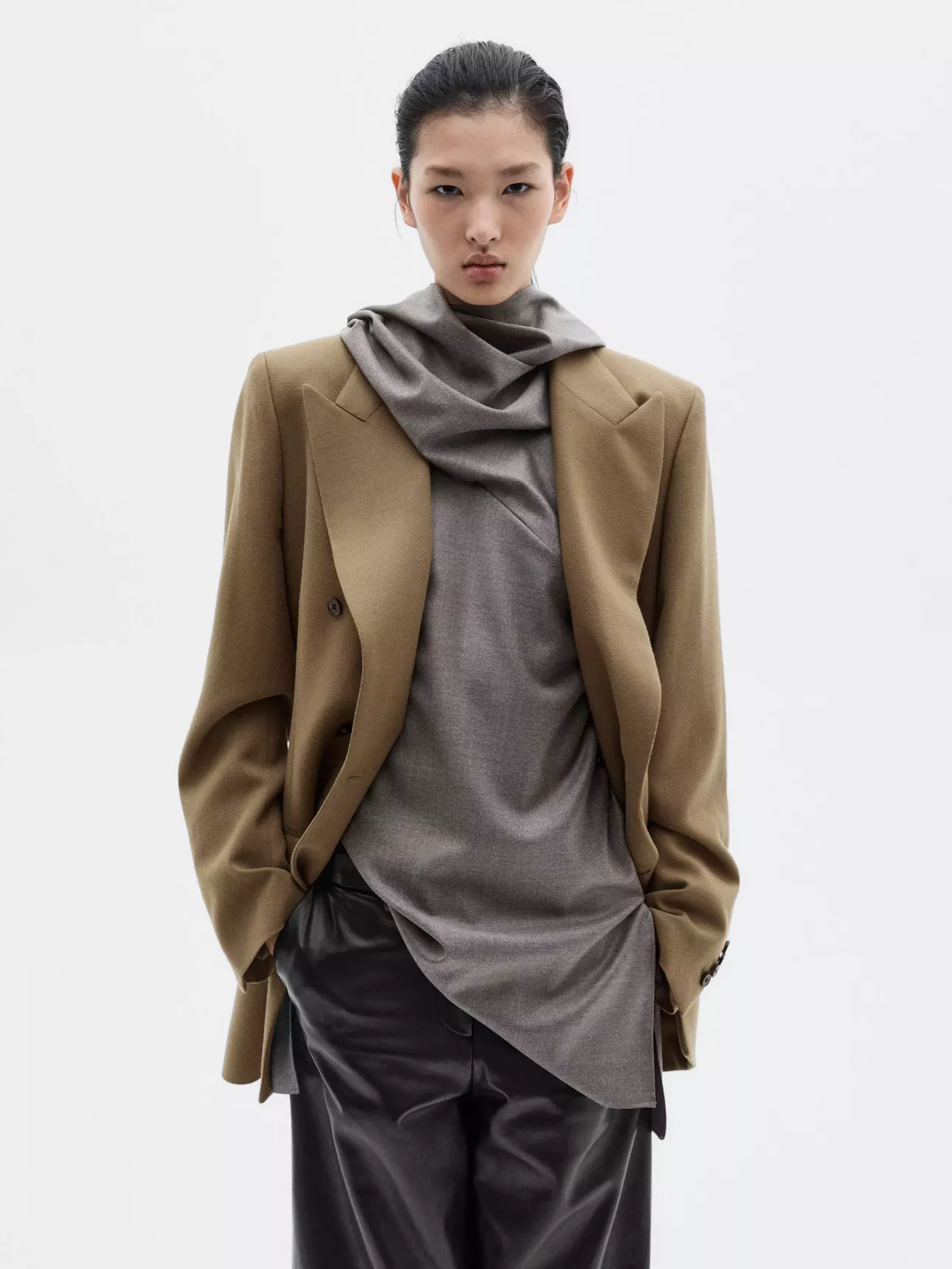 Οι σιλουέτες είναι καλοδουλεμένες και φινετσάτες, αλλά ταυτόχρονα διατηρούν μια φυσική ρευστότητα. Τα σακάκια έχουν καθαρές γραμμές και έντονους ώμους, ενώ τα παντελόνια και τα παλτό ακολουθούν πιο χαλαρές φόρμες που αγκαλιάζουν το σώμα χωρίς να το περιορίζουν. Το αποτέλεσμα είναι ένας διάλογος ανάμεσα στο αυστηρό και το μαλακό, στο ραφιναρισμένο και το φυσικό.
