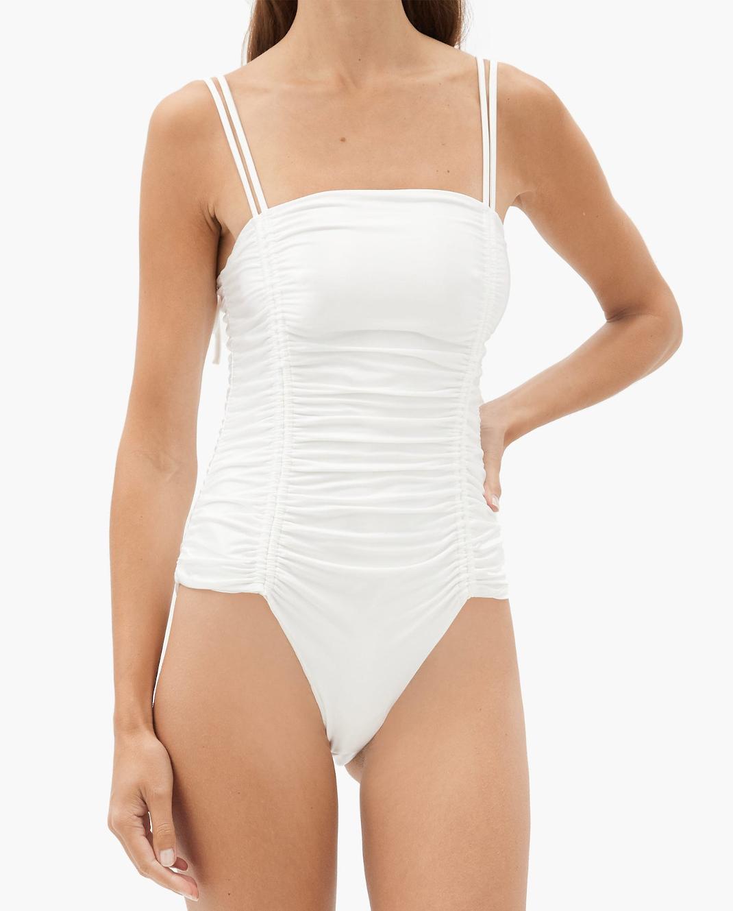 Η στιλιστική πεμπτουσία του καλοκαιριού συμπυκνώνεται σε ένα διαχρονικά κομψό, εντυπωσιακό λευκό μαγιό