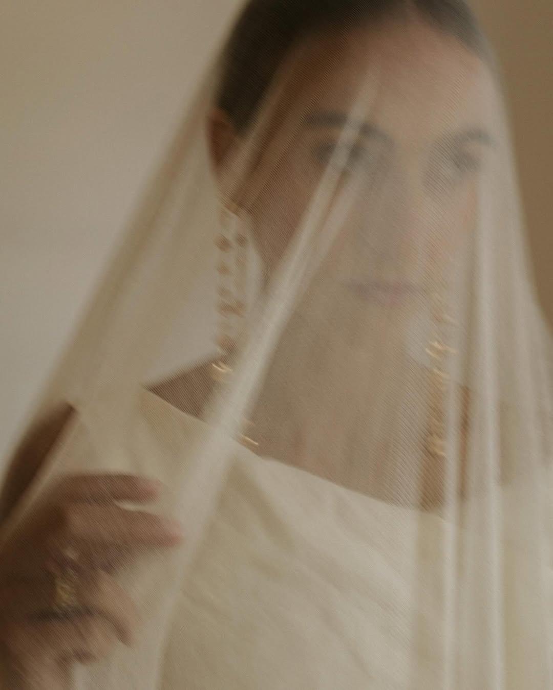 Το πέπλο ήταν από ρέον σιφόν, με μια απαλή βολάν στην άκρη που πρόσθετε μια νυφική, ρομαντική πινελιά. Η διαφάνεια του επέτρεπε στα σκουλαρίκια να φαίνονται διακριτικά, προσθέτοντας λάμψη χωρίς να κυριαρχούν στην εμφάνιση.