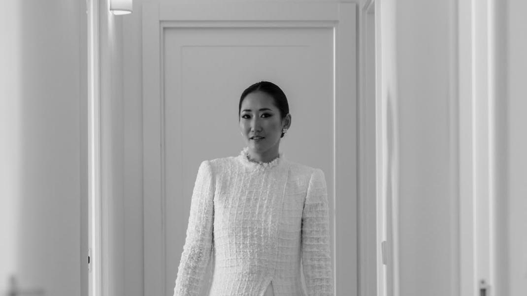 Η νύφη επέλεξε ένα τουίντ φόρεμα, μια απρόσμενη αλλά απόλυτα ταιριαστή επιλογή για έναν γάμο τον Μάιο. Άλλωστε, η ανοιξιάτικη Μαδρίτη συχνά κρύβει δροσερές στιγμές, κάνοντας το αποτέλεσμα όχι μόνο πρακτικό αλλά και ιδιαίτερα εντυπωσιακό. Το φόρεμα έφερε την υπογραφή της Inuñez, με τη Xie να θυμάται χαρακτηριστικά: «Μόλις τη γνώρισα, ήξερα ότι θα σχεδίαζε το νυφικό μου».