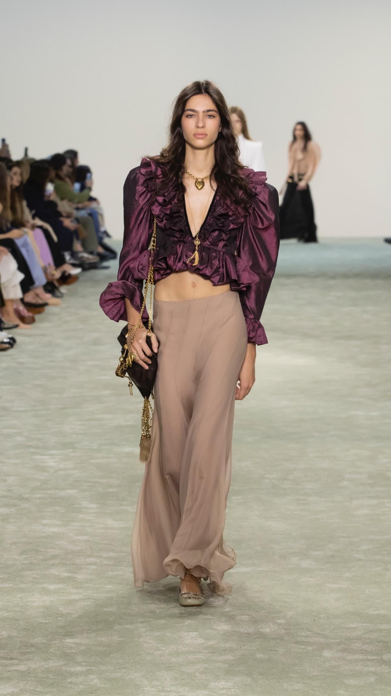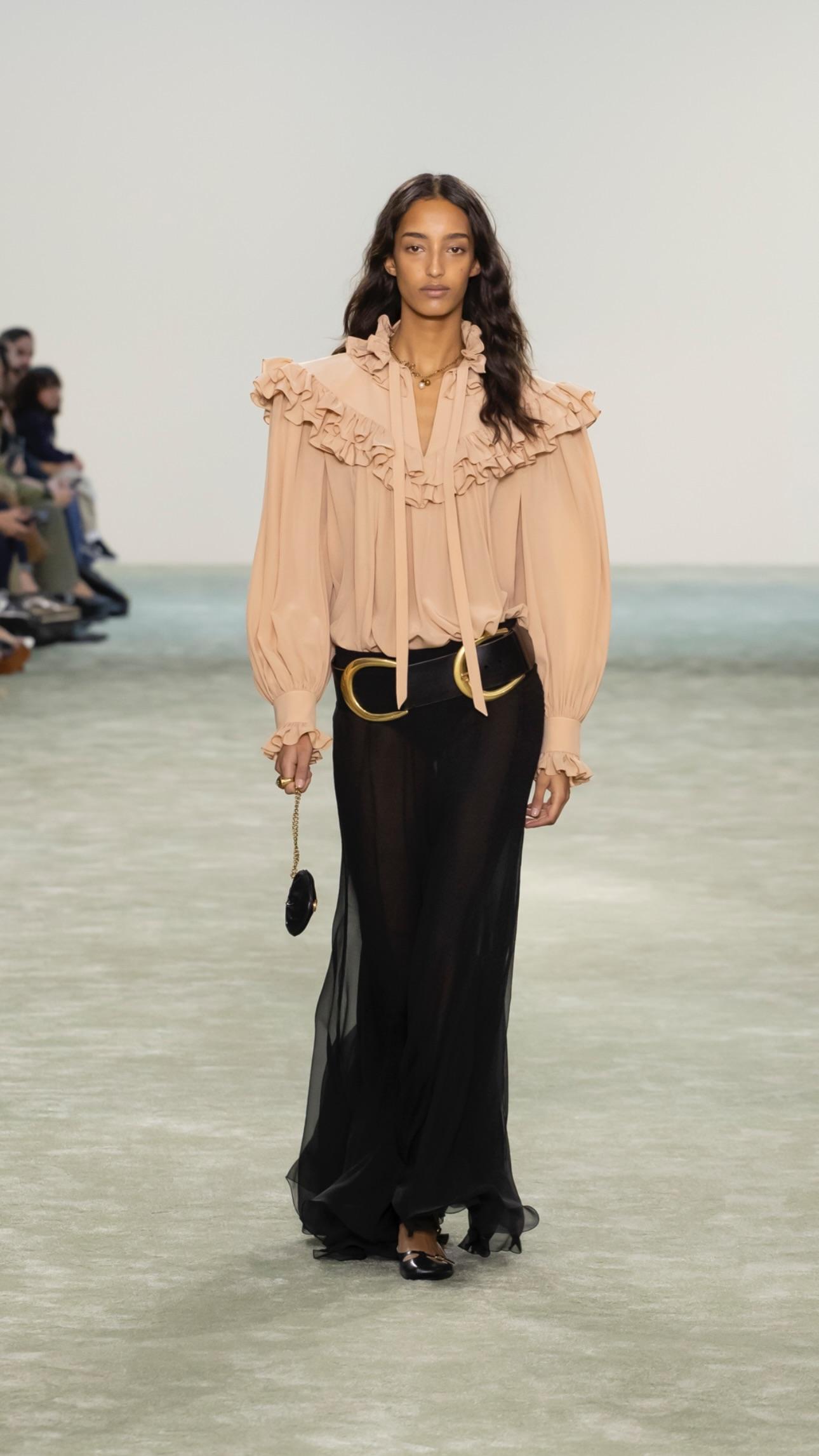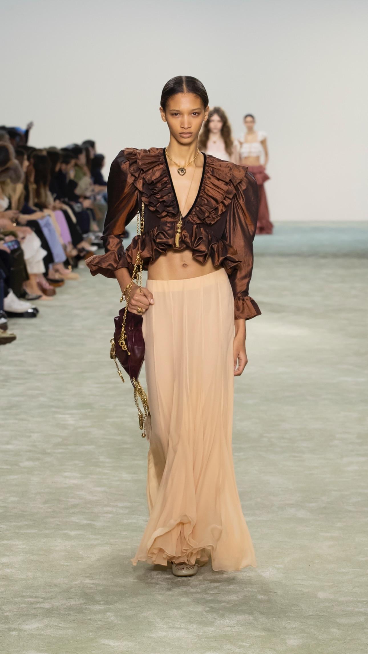 Εν μέσω μιας τάσης για αυστηρό μινιμαλισμό, η Chloé προτείνει έναν κόσμο γεμάτο αισθησιασμό και ανάλαφρη πολυτέλεια. Η χρωματική παλέτα, με ουδέτερους τόνους και πινελιές από απαλό μπλε, ροζ, τιρκουάζ και βατόμουρο, προσέδωσε μια ποιητική διάσταση στις δημιουργίες. Τα ρευστά φορέματα από σατέν και δαντέλα της δεκαετίας του '30 συνδυάστηκαν με statement δερμάτινα trench coats, αναδεικνύοντας την ισορροπία μεταξύ ρομαντισμού και δυναμισμού.