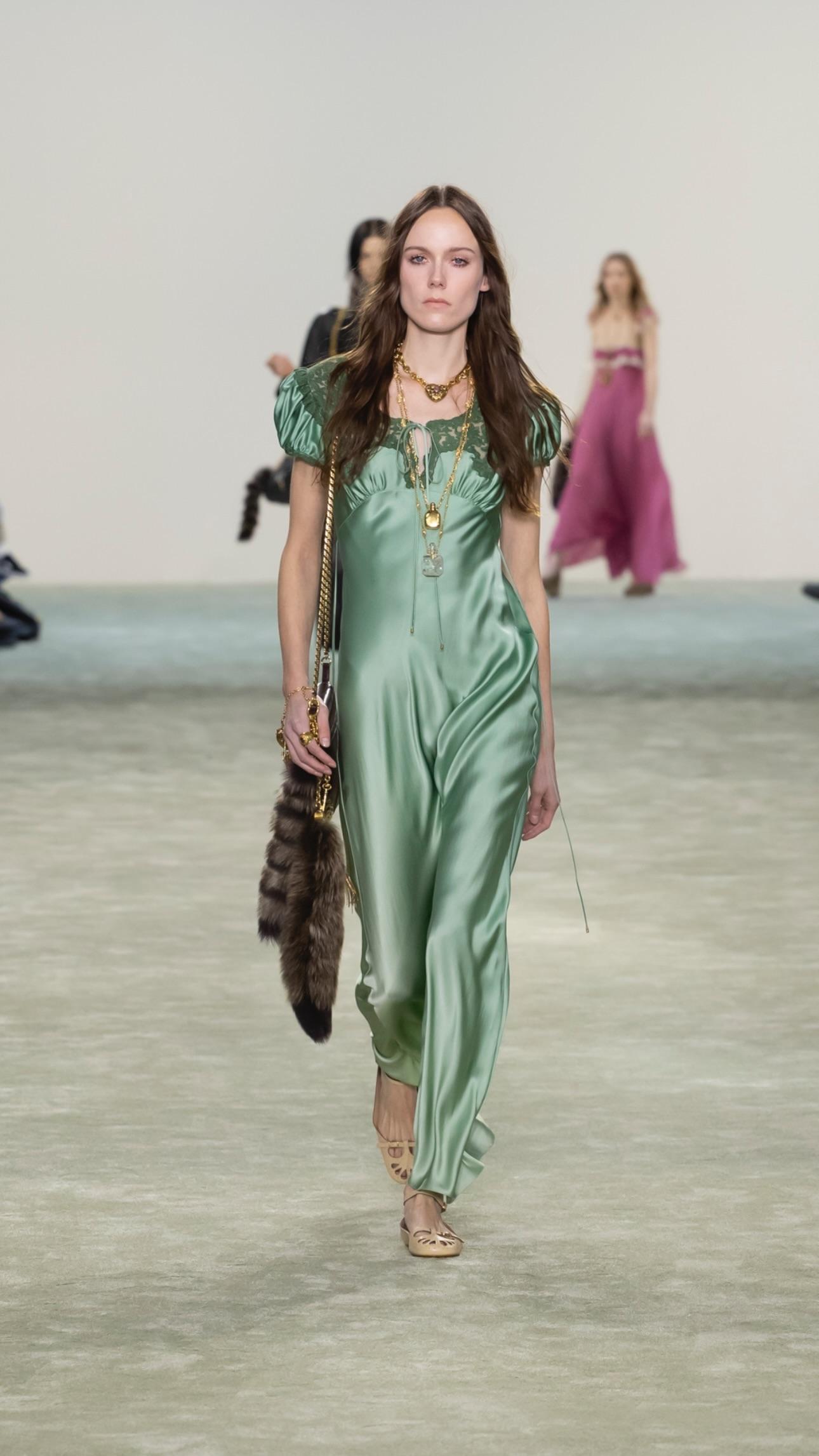 Το highlight της συλλογής ήταν ένα slip dress κομμένο λοξά, σε παστέλ αποχρώσεις. Στην ιστορία της μόδας, το slip dress έχει φορεθεί από μερικές από τις πιο διάσημες γυναίκες του κόσμου –η Carolyn Bessette-Kennedy προτιμούσε τα μίνιμαλ σχέδια του Calvin Klein, ενώ η πριγκίπισσα Νταϊάνα εμφανίστηκε στο Met Ball το 1996 με ένα εκθαμβωτικό φόρεμα Dior. Σήμερα, στην πασαρέλα της Chloé, το slip dress φορέθηκε από την Alexa Chung, συνδυασμένο με φλατ παπούτσια και faux γούνα.