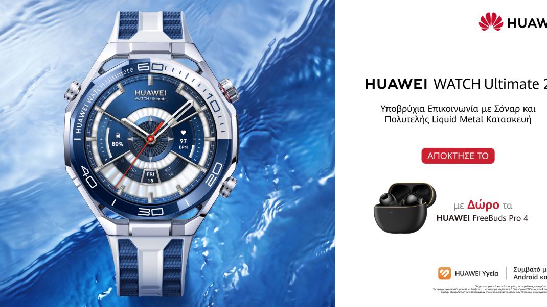 Διαθέσιμο στην Ελλάδα από 8 Οκτωβρίου 2025, είναι το HUAWEI WATCH Ultimate 2, το πρώτο smartwatch που υποστηρίζει υποβρύχια επικοινωνία με τεχνολογία sonar, προσφέροντας ασύγκριτη ασφάλεια και ευκολία στις καταδύσεις. Η συνέχεια του επιτυχημένου HUAWEI WATCH Ultimate, το Watch Ultimate 2, έρχεται με δώρο τα HUAWEI Freebuds Pro 4 με κάθε αγορά.