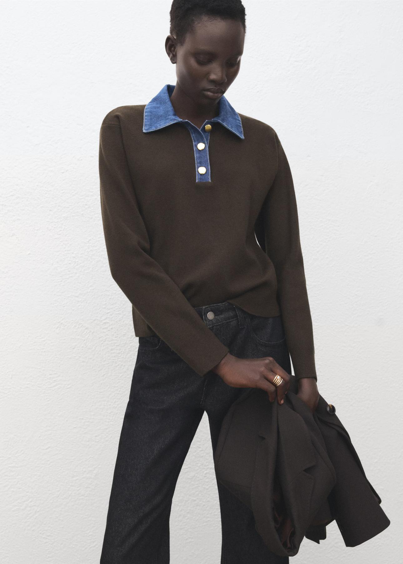 Ξεκινώντας από το πουλόβερ με τη διακριτική αλλά ιδιαίτερη λεπτομέρεια, βλέπουμε πώς ένα καθημερινό ρούχο μπορεί να αποκτήσει χαρακτήρα. Το σοκολατί καφέ χρώμα και ο γιακάς σε ύφος polo δίνουν στο κλασικό πλεκτό μια πιο σύγχρονη, σχεδόν elevated διάσταση. Είναι από εκείνα τα κομμάτια που φοριούνται από το πρωί μέχρι το βράδυ και ταιριάζουν τόσο με τζιν όσο και με πιο αυστηρές γραμμές.