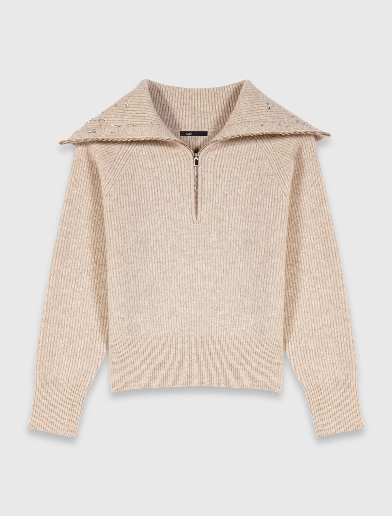Μπεζ half-zip πουλόβερ με διακοσμητικές πέτρες Maje/ Δείτε εδώ
