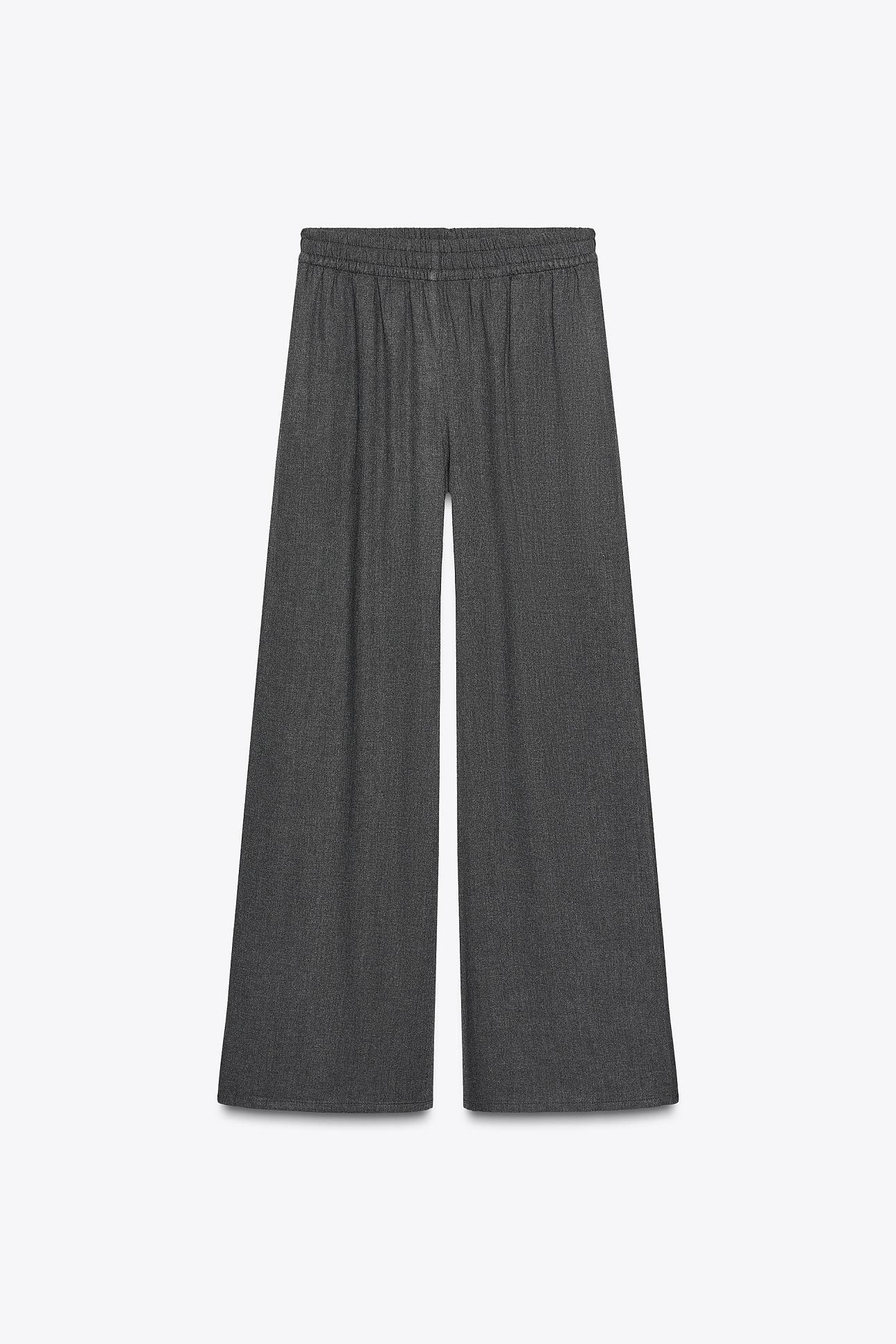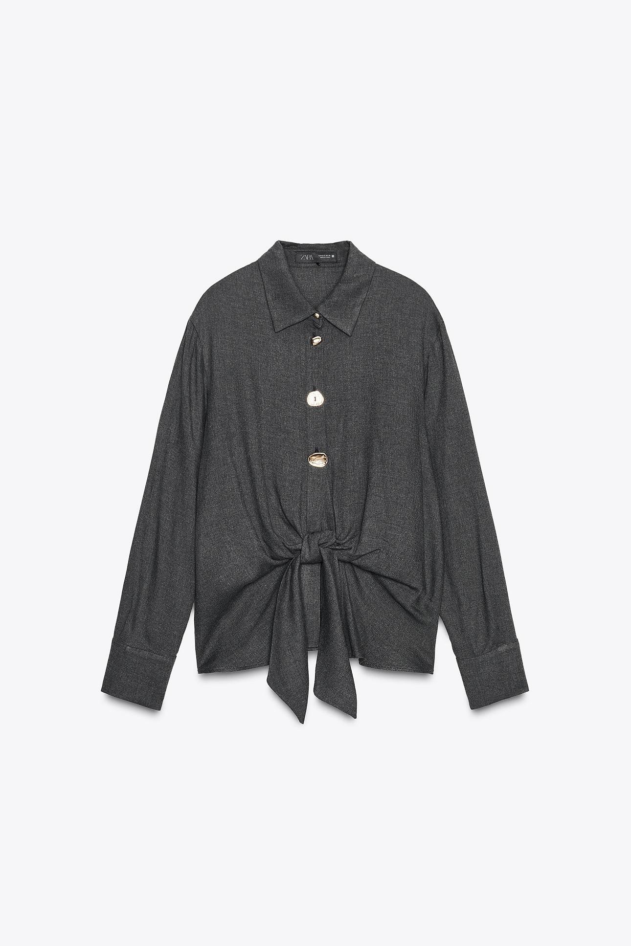 Ανάμεσα στις νέες αφίξεις των Zara ξεχωρίζει ένα σκούρο γκρι σετ δύο τεμαχίων. Το πουκάμισο με κουμπιά και λεπτομέρεια κόμπου, μαζί με το φαρδύ παντελόνι από βισκόζη με ελαστική ζώνη, προσφέρει άνεση και κομψότητα. Τα ασύμμετρα μεταλλικά κουμπιά προσθέτουν μια διακριτική πινελιά πολυτέλειας, ενώ οι συνδυασμοί με μεγάλα σκουλαρίκια, βραχιόλια ή λαμπερά δαχτυλίδια ολοκληρώνουν την εμφάνιση.