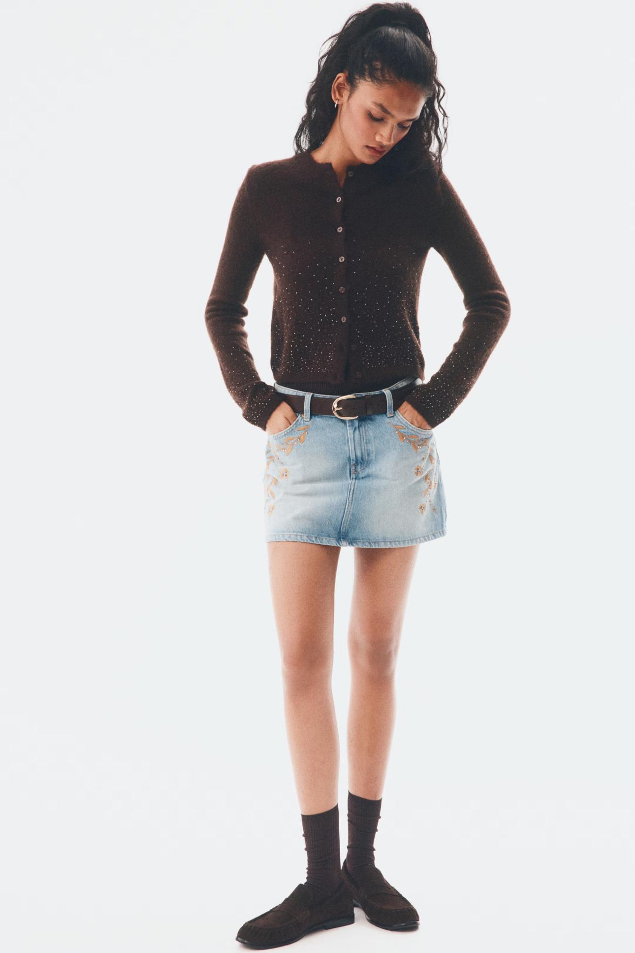 Μίνι τζιν φούστα με κεντήματα Η&Μ/ Δείτε εδώ