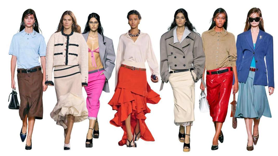 Σε αντίθεση με τη φούστα που τονίζει τη μέση, η χαμηλόμεση εκδοχή κάθεται πιο χαμηλά, στους γοφούς, δημιουργώντας μια διαφορετική ισορροπία στη σιλουέτα. Στις επιδείξεις μεγάλων οίκων μόδας, όπως της Tory Burch, του The Attico και της Chanel, η χαμηλή μέση εμφανίστηκε σε πολλές εκδοχές: από κομψές midi φούστες μέχρι αυστηρές pencil γραμμές και πλισέ σχέδια.