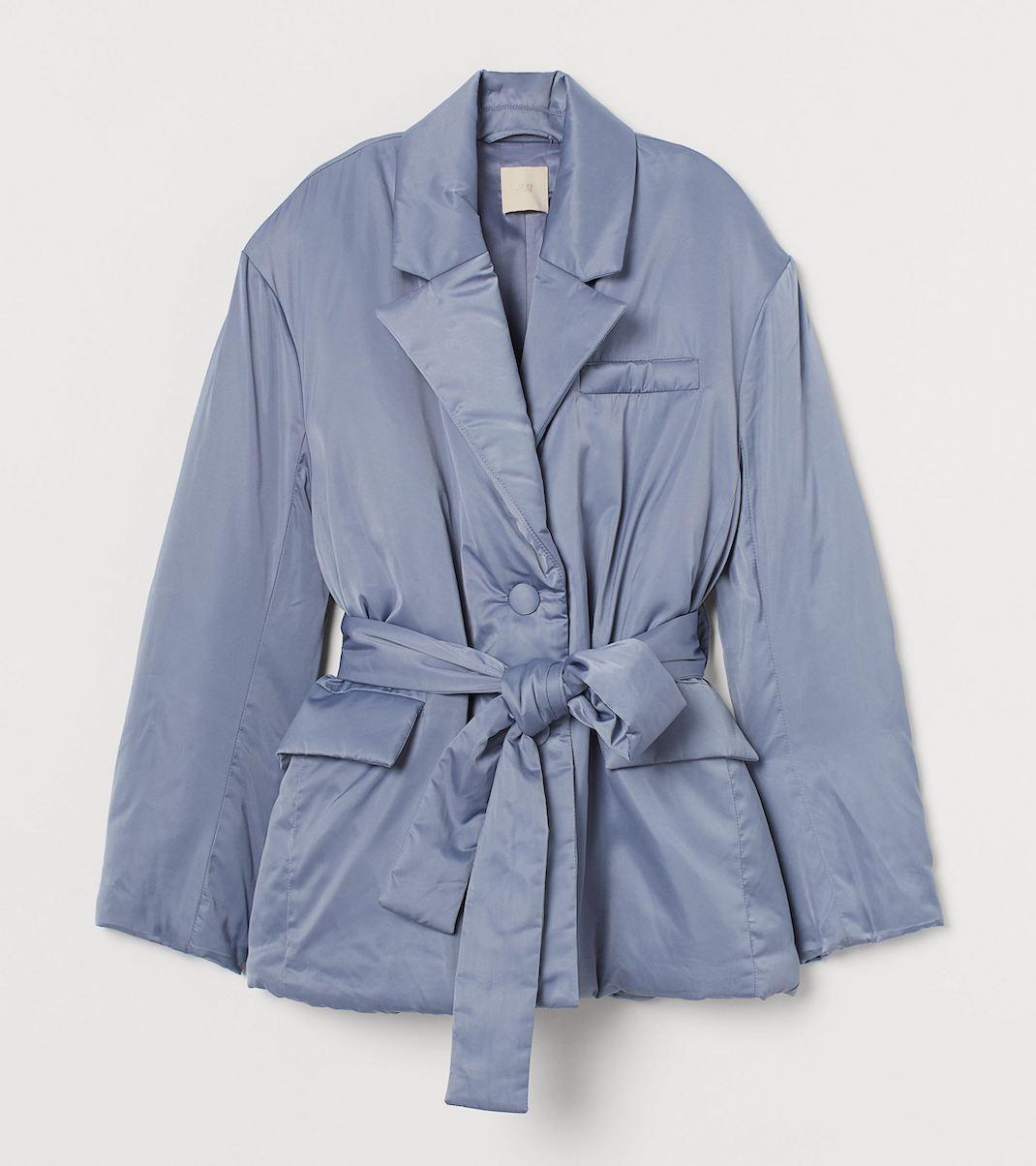 Ένα γαλάζιο jacket σε σχήμα σακακιού που φουσκώνει ελαφρά και δένει στη μέση με ζώνη.