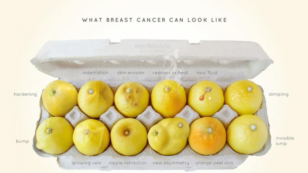 Τα συμπτώματα του καρκίνου του μαστού καταγράφονται ευφυώς σε μια εικόνα, όπου αντί για γυναικείο στήθος, βλέπουμε...λεμόνια.