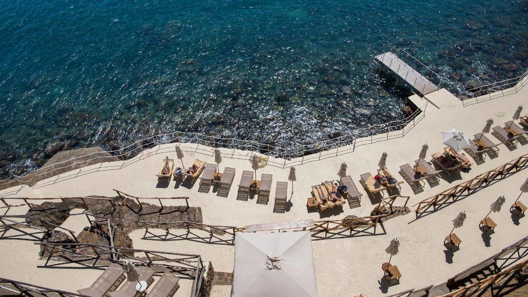 Η παραλία του είναι βραχώδης ενώ οι ξαπλώστρες βρίσκονται πιο πάνω, σε έναν μικρό ορμίσκο. Μια ξύλινη εξέδρα σου επιτρέπει να μπεις στη θάλασσα κατεβαίνοντας μερικά σκαλοπάτια. Ακόμη, διαθέτει μια πολυτελή πισίνα με θαλασσινό νερό, σε μια χαμηλή ταράτσα.