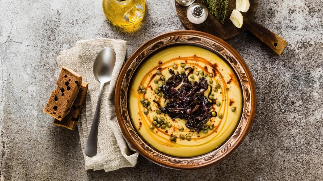 Καθαρά Δευτέρα: Συνταγή για φάβα με καραμελωμένα πράσα και κάπαρη