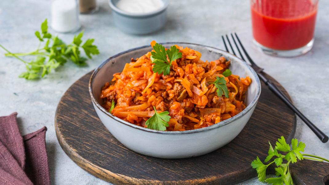 Αν και το έχουμε συνηθίσει λευκό, το ντοματένιο λαχανόρυζο έχει τη δική του ξεχωριστή νοστιμιά.